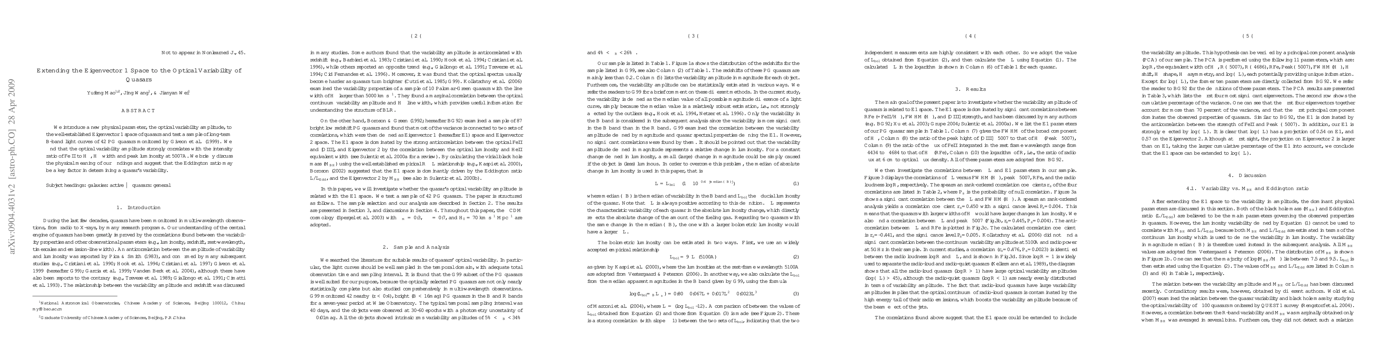 We introduce a new physical parameter, the optical variability amplitude, to the well-established Eigenvector 1 space of quasars and test a sample of long-term B-band light curves of 42 PG quasars monitored by Giveon et al. (1999). We find that the optical variability amplitude strongly correlates with the intensity ratio of Fe II to H$\beta$, H$\beta$ width and peak luminosity at 5007$\rm{\AA}$. We briefly discuss the physical meaning of our findings and suggest that the Eddington ratio may be a key factor in determining a quasar's variability.