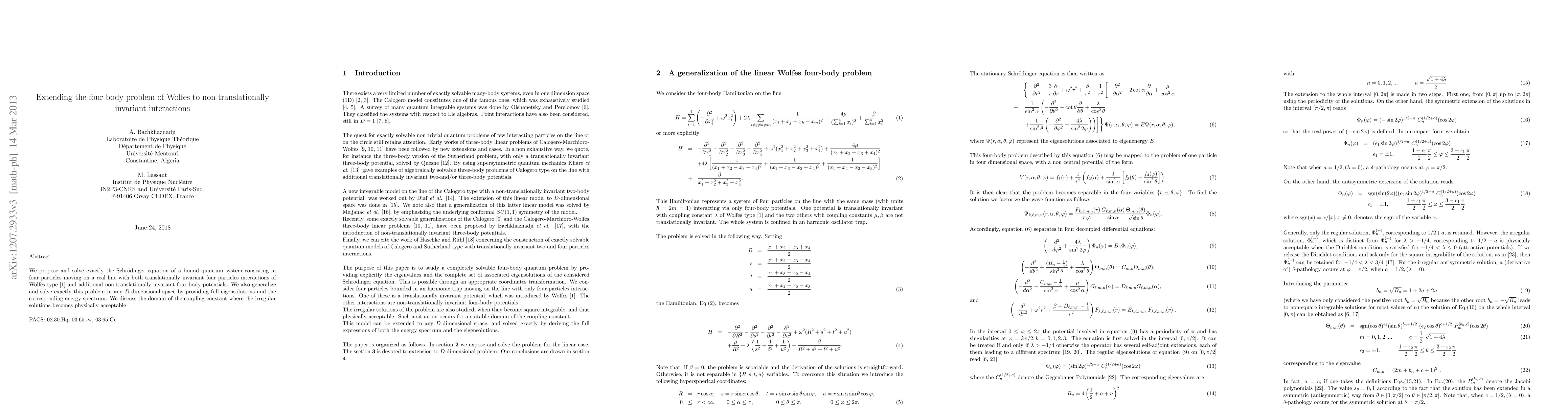 We propose and solve exactly the Schr\"odinger equation of a bound quantum system consisting in four particles moving on a real line with both translationally invariant four particles interactions of Wolfes type \cite{Wolf74} and additional non translationally invariant four-body potentials. We also generalize and solve exactly this problem in any $D$-dimensional space by providing full eigensolutions and the corresponding energy spectrum. We discuss the domain of the coupling constant where the irregular solutions becomes physically acceptable