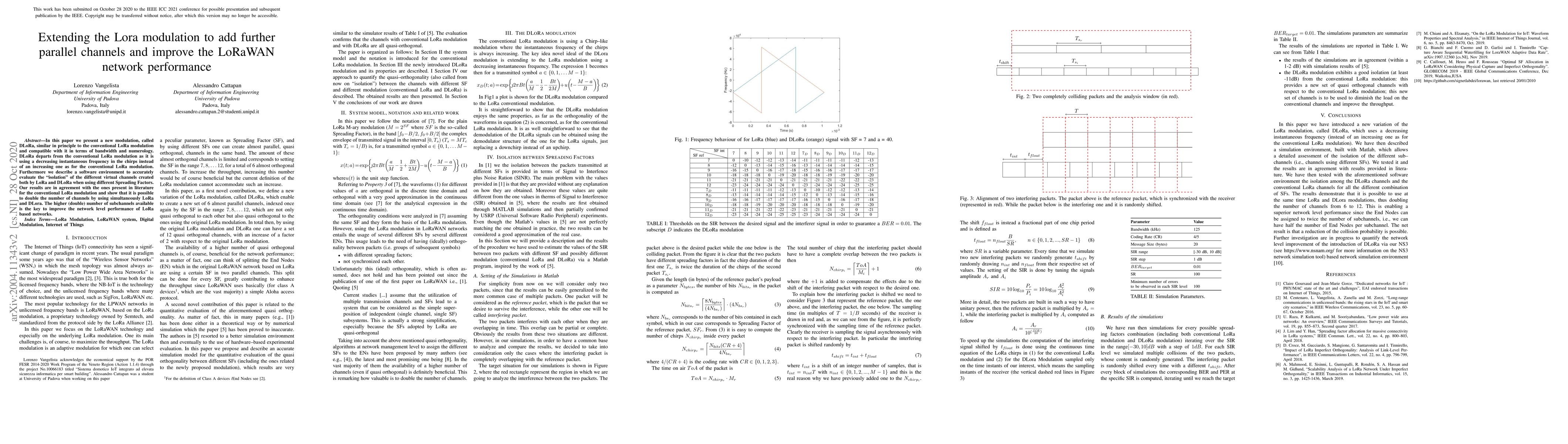 This paper introduces DLoRa, a new modulation technique that enhances LoRaWAN performance by doubling the number of parallel channels through a decreasing frequency chirp approach. The study also presents a software environment to evaluate the isolation of these channels, confirming improved network performance.