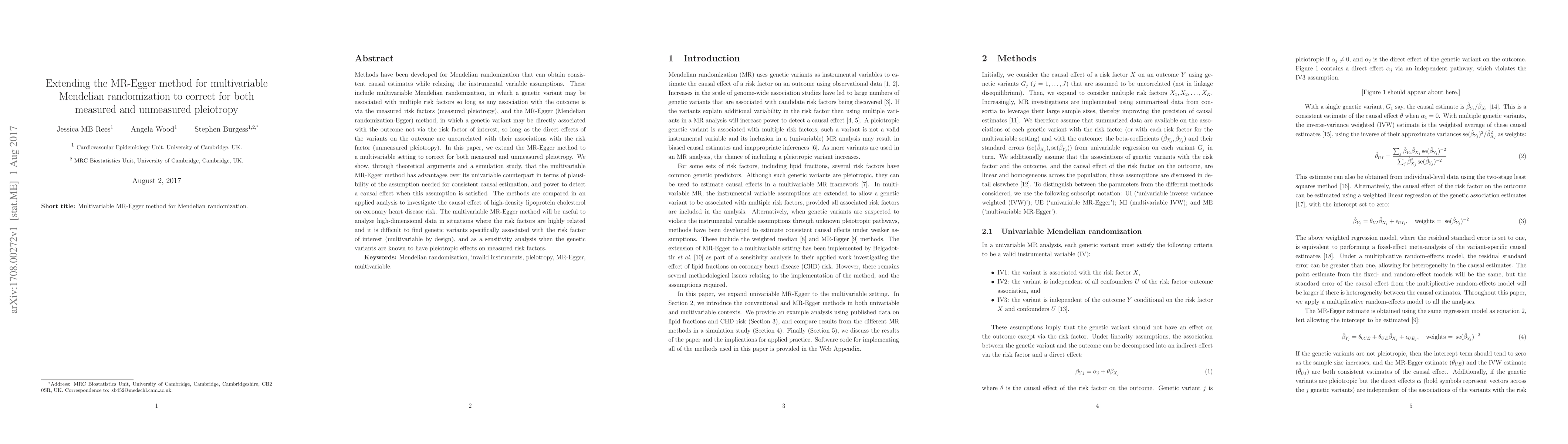 This paper extends the MR-Egger method for Mendelian randomization to a multivariable setting, allowing it to correct for both measured and unmeasured pleiotropy. The new multivariable MR-Egger method is shown to be more powerful and plausible than its univariable counterpart, demonstrated through theoretical arguments, simulations, and an applied analysis on the causal effect of cholesterol on coronary heart disease.