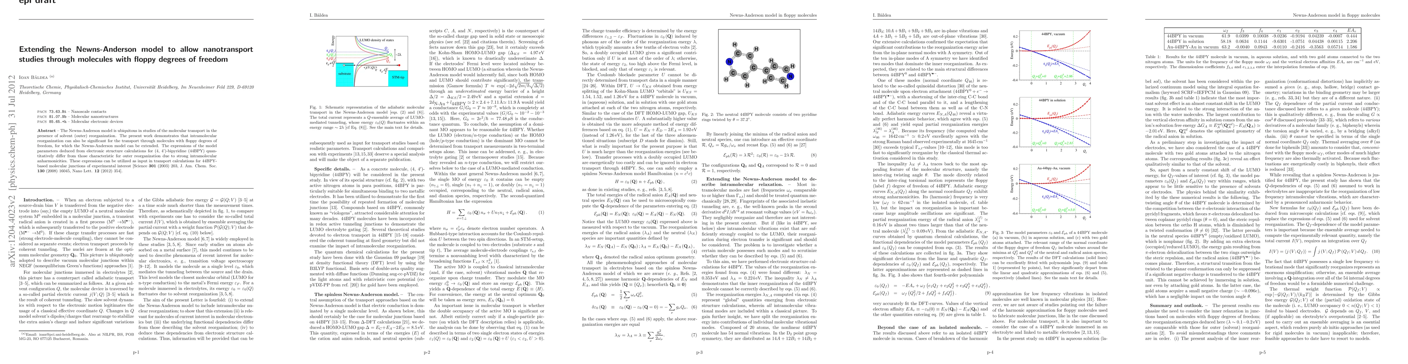 This paper extends the Newns-Anderson model to account for intramolecular reorganization in molecules with floppy degrees of freedom, demonstrating its significance in nanotransport studies. The model parameters derived from electronic structure calculations for (4, 4')-bipyridine show strong intramolecular anharmonicities, providing a new input for transport calculations in molecular junctions.