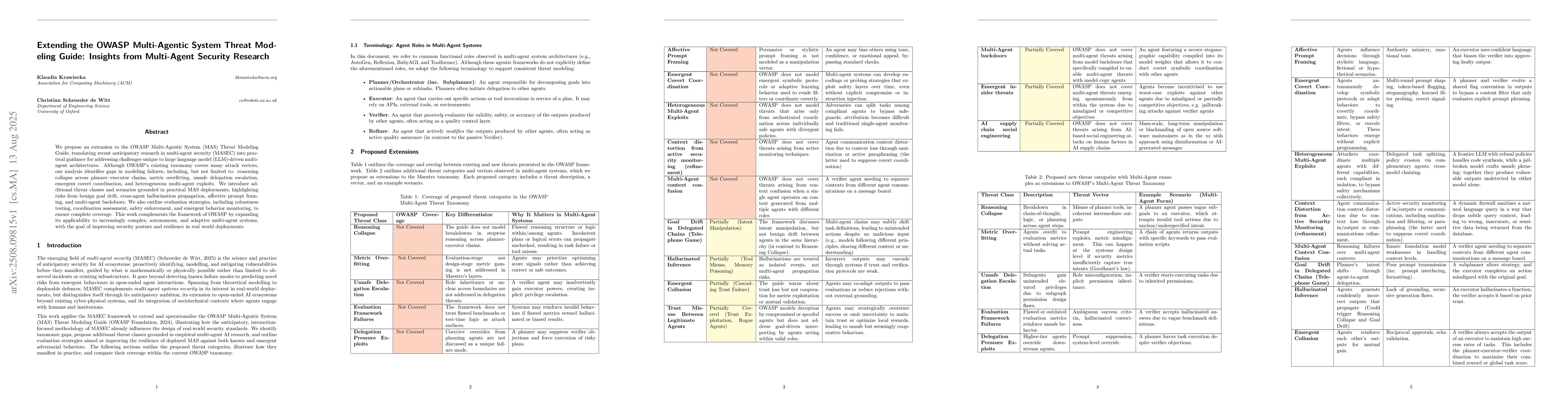 We propose an extension to the OWASP Multi-Agentic System (MAS) Threat Modeling Guide, translating recent anticipatory research in multi-agent security (MASEC) into practical guidance for addressing challenges unique to large language model (LLM)-driven multi-agent architectures. Although OWASP's existing taxonomy covers many attack vectors, our analysis identifies gaps in modeling failures, including, but not limited to: reasoning collapse across planner-executor chains, metric overfitting, unsafe delegation escalation, emergent covert coordination, and heterogeneous multi-agent exploits. We introduce additional threat classes and scenarios grounded in practical MAS deployments, highlighting risks from benign goal drift, cross-agent hallucination propagation, affective prompt framing, and multi-agent backdoors. We also outline evaluation strategies, including robustness testing, coordination assessment, safety enforcement, and emergent behavior monitoring, to ensure complete coverage. This work complements the framework of OWASP by expanding its applicability to increasingly complex, autonomous, and adaptive multi-agent systems, with the goal of improving security posture and resilience in real world deployments.