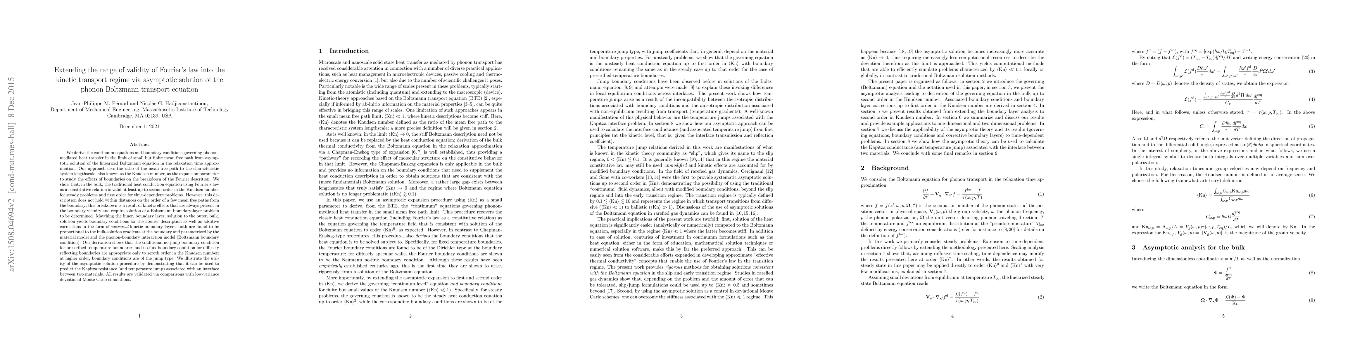 We derive the continuum equations and boundary conditions governing phonon-mediated heat transfer in the limit of small but finite mean free path from asymptotic solution of the linearized Boltzmann equation in the relaxation time approximation. Our approach uses the ratio of the mean free path to the characteristic system lengthscale, also known as the Knudsen number, as the expansion parameter to study the effects of boundaries on the breakdown of the Fourier descrition. We show that, in the bulk, the traditional heat conduction equation using Fourier's law as a constitutive relation is valid at least up to second order in the Knudsen number for steady problems and first order for time-dependent problems. However, this description does not hold within distances on the order of a few mean free paths from the boundary; this breakdown is a result of kinetic effects that are always present in the boundary vicinity and require solution of a Boltzmann boundary-layer problem to be determined. Matching the inner, boundary layer, solution to the outer, bulk, solution yields boundary conditions for the Fourier description as well as additive corrections in the form of universal kinetic boundary layers; both are found to be proportional to the bulk-solution gradients at the boundary and parametrized by the material model and the phonon-boundary interaction model (Boltzmann boundary condition). Our derivation shows that the traditional no-jump boundary condition for prescribed temperature boundaries and no-flux boundary condition for diffusely reflecting boundaries are appropriate only to zeroth order in the Knudsen number; at higher order, boundary conditions are of the jump type. We illustrate the utility of the asymptotic solution procedure by demonstrating that it can be used to predict the Kapitza resistance (and temperature jump) associated with an interface between two materials.