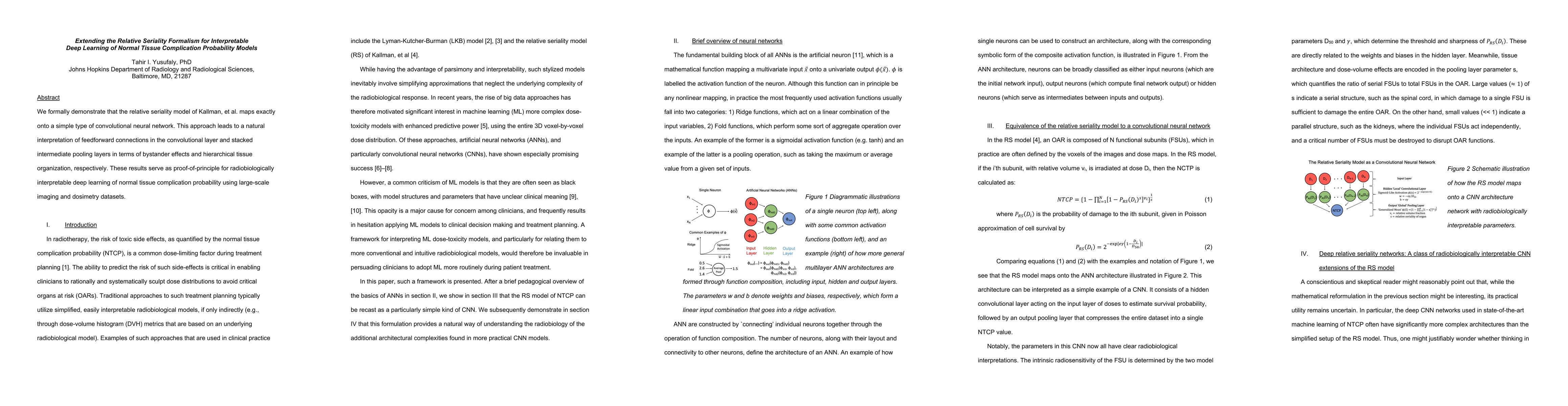 We formally demonstrate that the relative seriality model of Kallman, et al. maps exactly onto a simple type of convolutional neural network. This approach leads to a natural interpretation of feedforward connections in the convolutional layer and stacked intermediate pooling layers in terms of bystander effects and hierarchical tissue organization, respectively. These results serve as proof-of-principle for radiobiologically interpretable deep learning of normal tissue complication probability using large-scale imaging and dosimetry datasets.