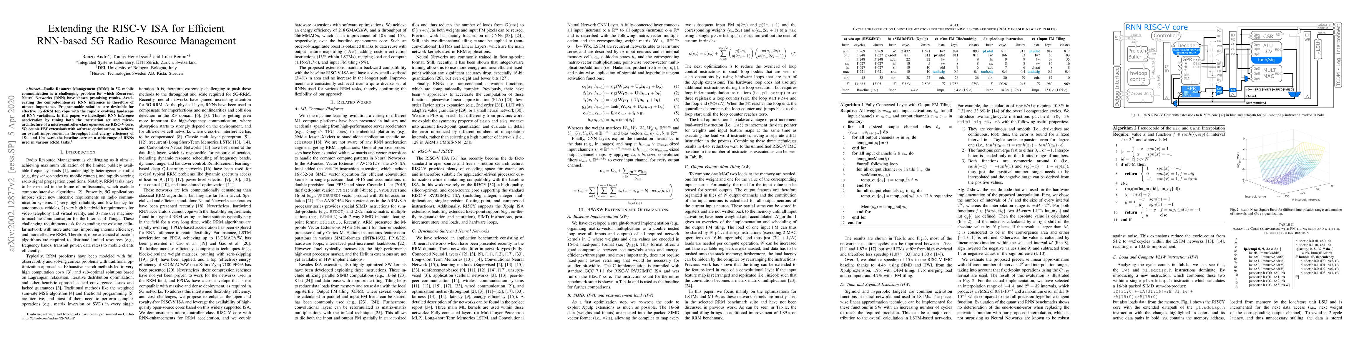 Radio Resource Management (RRM) in 5G mobile communication is a challenging problem for which Recurrent Neural Networks (RNN) have shown promising results. Accelerating the compute-intensive RNN inference is therefore of utmost importance. Programmable solutions are desirable for effective 5G-RRM top cope with the rapidly evolving landscape of RNN variations. In this paper, we investigate RNN inference acceleration by tuning both the instruction set and micro-architecture of a micro-controller-class open-source RISC-V core. We couple HW extensions with software optimizations to achieve an overall improvement in throughput and energy efficiency of 15$\times$ and 10$\times$ w.r.t. the baseline core on a wide range of RNNs used in various RRM tasks.
