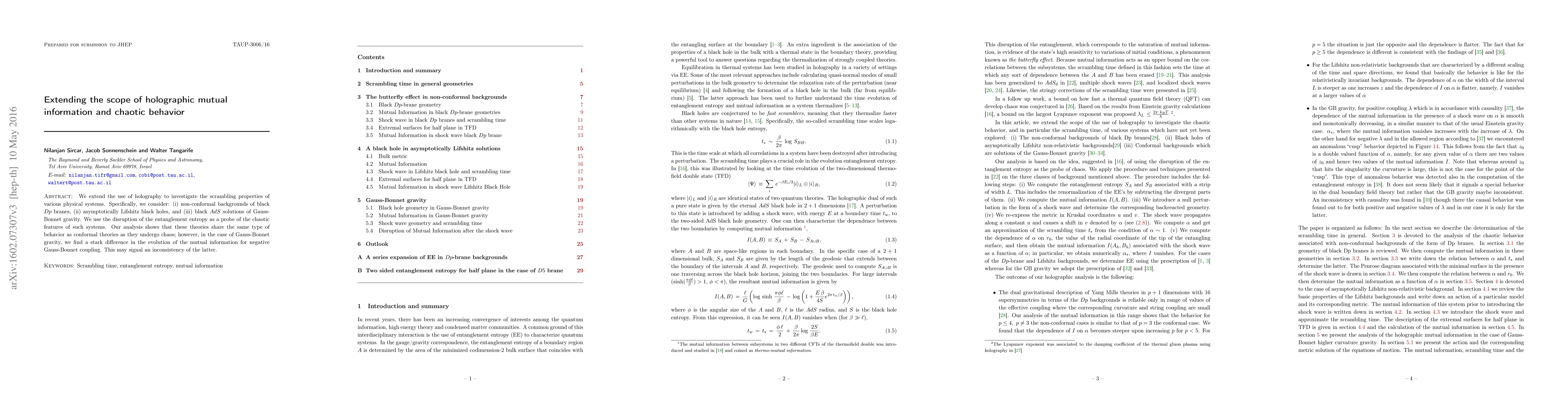 We extend the use of holography to investigate the scrambling properties of various physical systems. Specifically, we consider: (i) non-conformal backgrounds of black $Dp$ branes, (ii) asymptotically Lifshitz black holes, and (iii) black $AdS$ solutions of Gauss-Bonnet gravity. We use the disruption of the entanglement entropy as a probe of the chaotic features of such systems. Our analysis shows that these theories share the same type of behavior as conformal theories as they undergo chaos; however, in the case of Gauss-Bonnet gravity, we find a stark difference in the evolution of the mutual information for negative Gauss-Bonnet coupling. This may signal an inconsistency of the latter.
