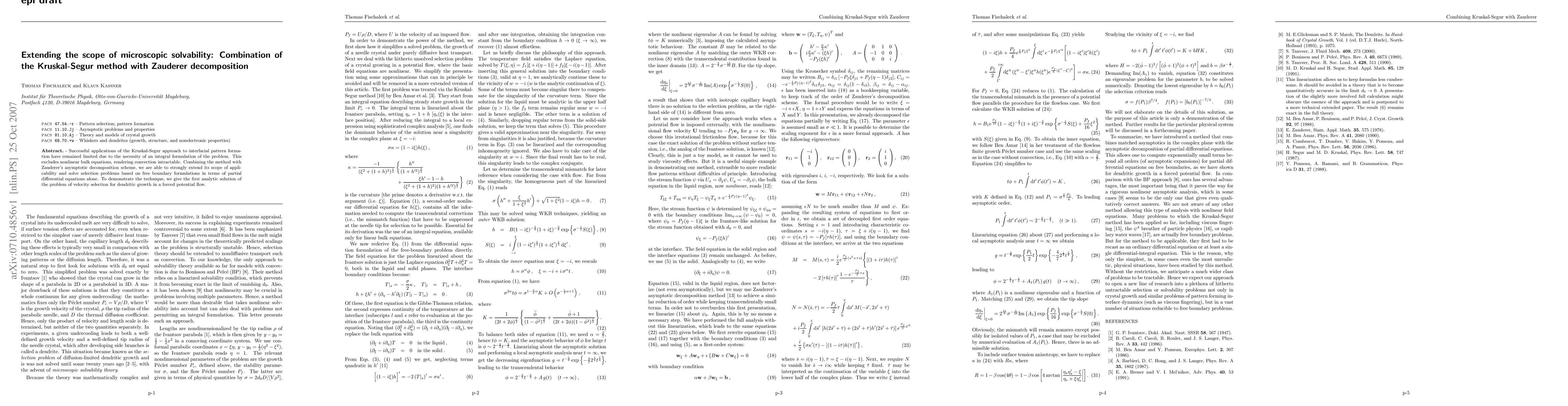 Successful applications of the Kruskal-Segur approach to interfacial pattern formation have remained limited due to the necessity of an integral formulation of the problem. This excludes nonlinear bulk equations, rendering convection intractable. Combining the method with Zauderer's asymptotic decomposition scheme, we are able to strongly extend its scope of applicability and solve selection problems based on free boundary formulations in terms of partial differential equations alone. To demonstrate the technique, we give the first analytic solution of the problem of velocity selection for dendritic growth in a forced potential flow.