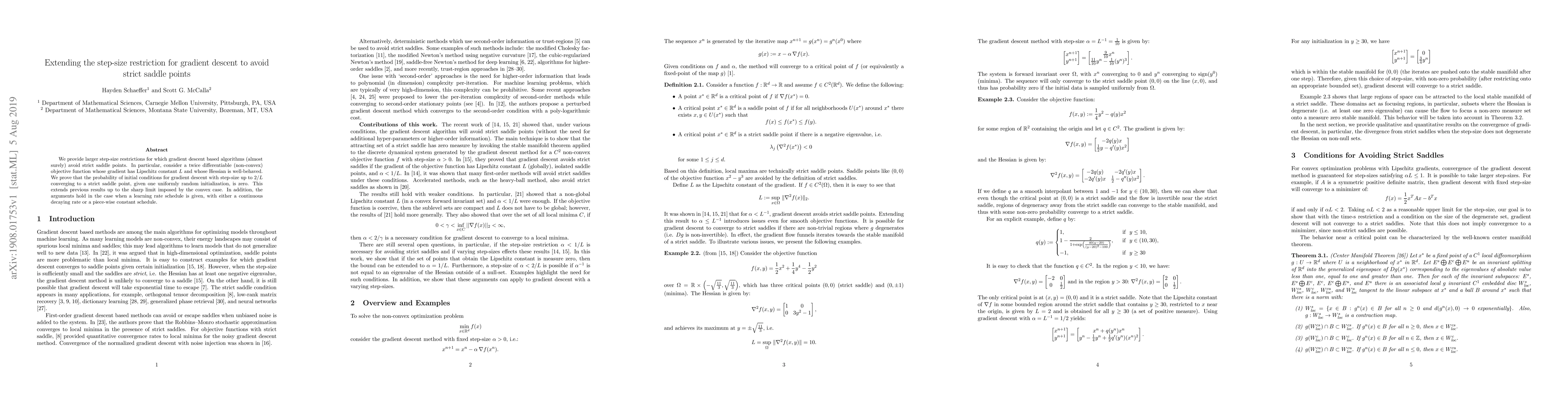 This research extends gradient descent's step-size allowance to avoid strict saddle points in non-convex optimization, proving that a step-size up to 2/L ensures avoidance with high probability. The methodology applies to both constant and decaying learning rate schedules.