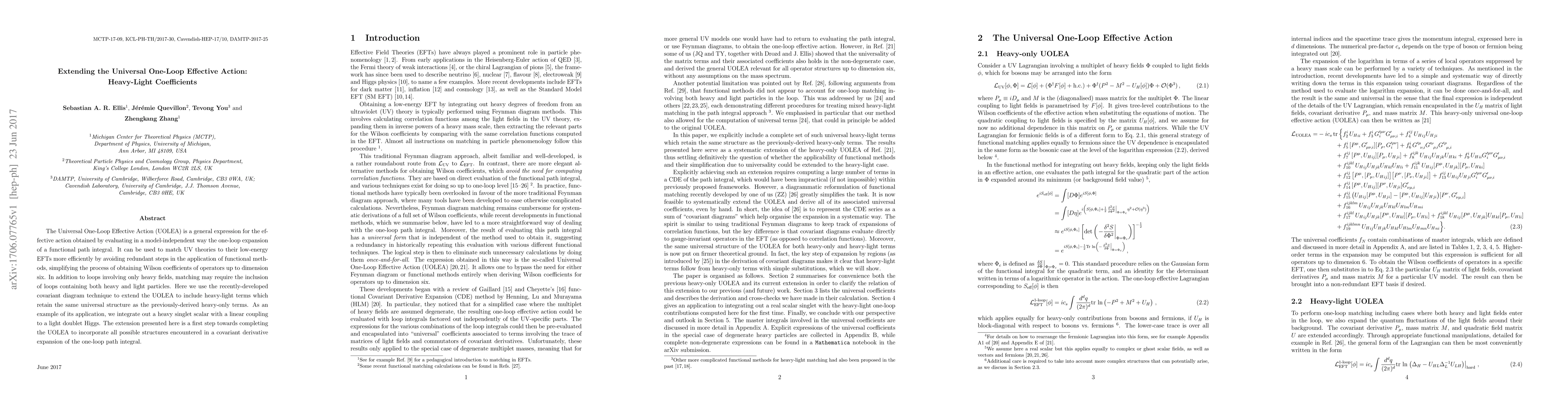 This paper extends the Universal One-Loop Effective Action (UOLEA) to include heavy-light coefficients using a covariant diagram technique, demonstrating its application by integrating out a heavy singlet scalar coupled to a light doublet Higgs. This extension aims to complete the UOLEA framework to handle all structures in the one-loop path integral.