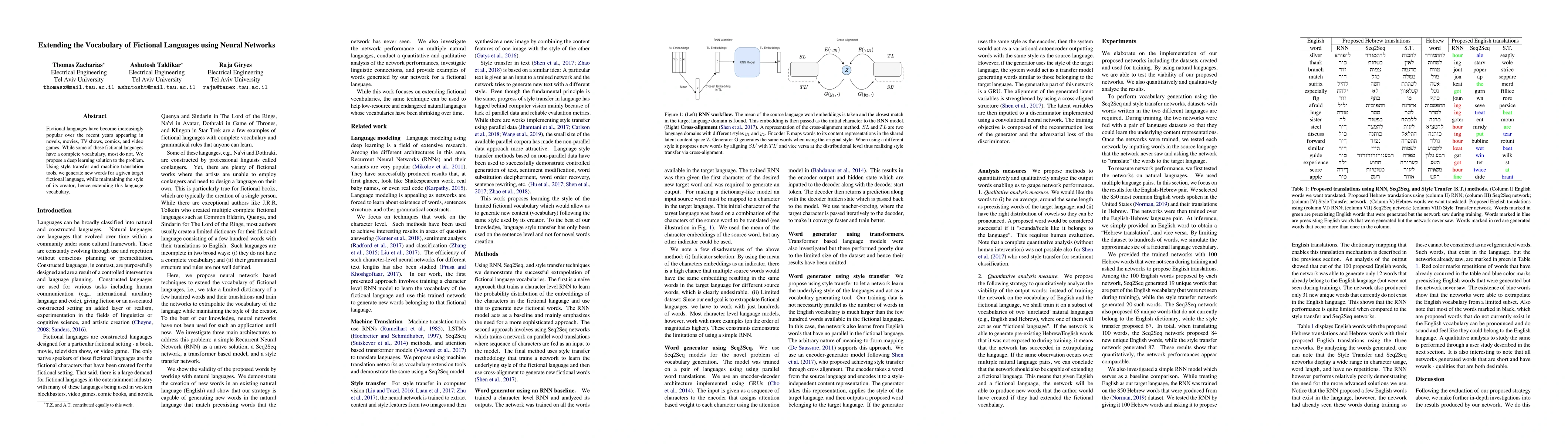 The paper proposes a deep learning solution using style transfer and machine translation tools to generate new words for a given target fictional language, maintaining the style of its creator.