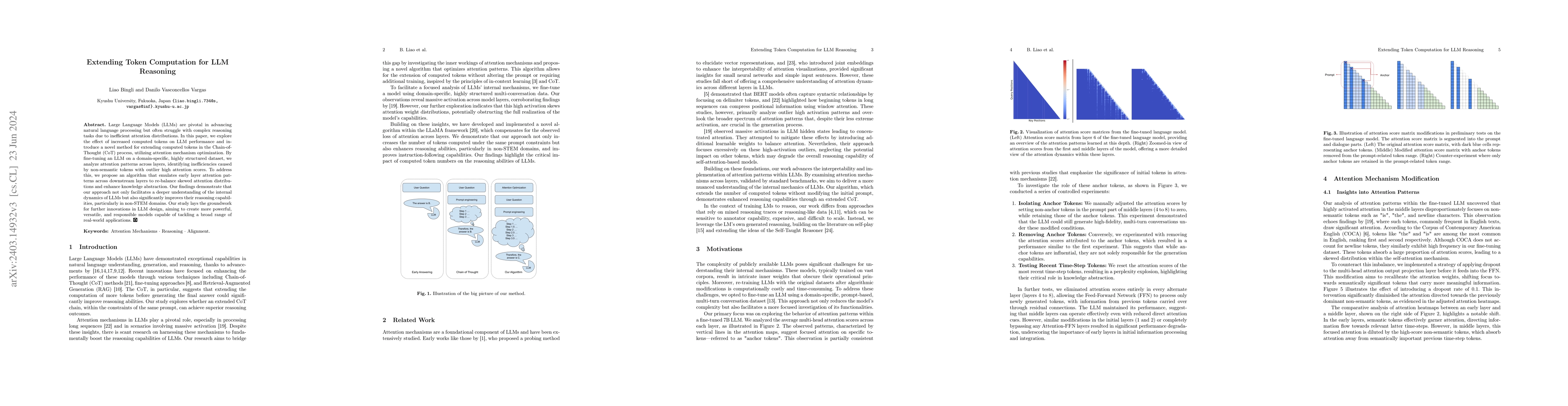 Large Language Models (LLMs) are pivotal in advancing natural language processing but often struggle with complex reasoning tasks due to inefficient attention distributions. In this paper, we explore the effect of increased computed tokens on LLM performance and introduce a novel method for extending computed tokens in the Chain-of-Thought (CoT) process, utilizing attention mechanism optimization. By fine-tuning an LLM on a domain-specific, highly structured dataset, we analyze attention patterns across layers, identifying inefficiencies caused by non-semantic tokens with outlier high attention scores. To address this, we propose an algorithm that emulates early layer attention patterns across downstream layers to re-balance skewed attention distributions and enhance knowledge abstraction. Our findings demonstrate that our approach not only facilitates a deeper understanding of the internal dynamics of LLMs but also significantly improves their reasoning capabilities, particularly in non-STEM domains. Our study lays the groundwork for further innovations in LLM design, aiming to create more powerful, versatile, and responsible models capable of tackling a broad range of real-world applications.