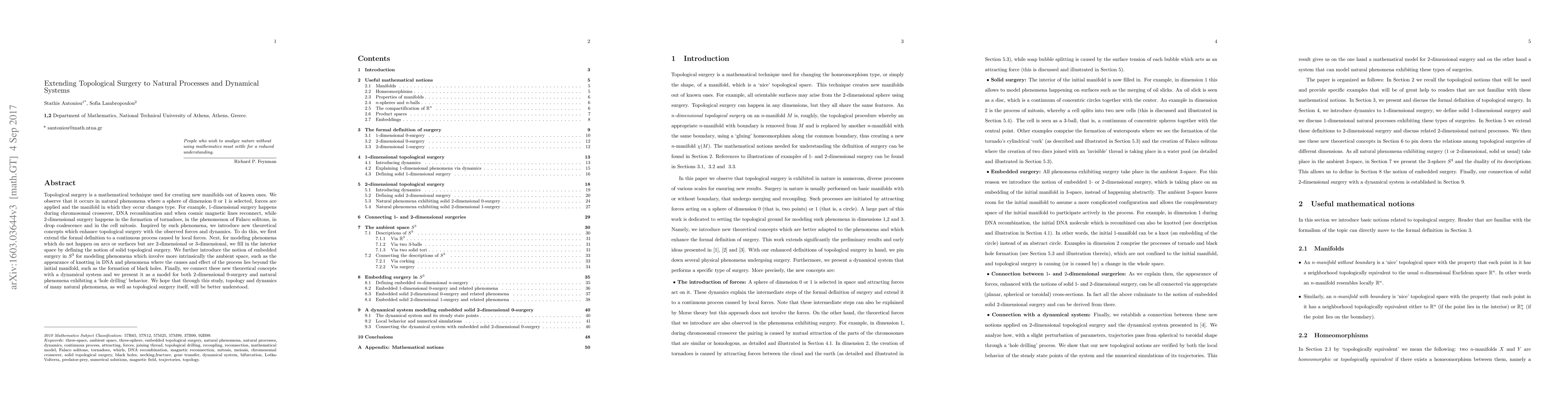Topological surgery is a mathematical technique used for creating new manifolds out of known ones. We observe that it occurs in natural phenomena where a sphere of dimension 0 or 1 is selected, forces are applied and the manifold in which they occur changes type. For example, 1-dimensional surgery happens during chromosomal crossover, DNA recombination and when cosmic magnetic lines reconnect, while 2-dimensional surgery happens in the formation of tornadoes, in the phenomenon of Falaco solitons, in drop coalescence and in the cell mitosis. Inspired by such phenomena, we introduce new theoretical concepts which enhance topological surgery with the observed forces and dynamics. To do this, we first extend the formal definition to a continuous process caused by local forces. Next, for modeling phenomena which do not happen on arcs or surfaces but are 2-dimensional or 3-dimensional, we fill in the interior space by defining the notion of solid topological surgery. We further introduce the notion of embedded surgery in $S^3$ for modeling phenomena which involve more intrinsically the ambient space, such as the appearance of knotting in DNA and phenomena where the causes and effect of the process lies beyond the initial manifold, such as the formation of black holes. Finally, we connect these new theoretical concepts with a dynamical system and we present it as a model for both 2-dimensional 0-surgery and natural phenomena exhibiting a `hole drilling' behavior. We hope that through this study, topology and dynamics of many natural phenomena, as well as topological surgery itself, will be better understood.
