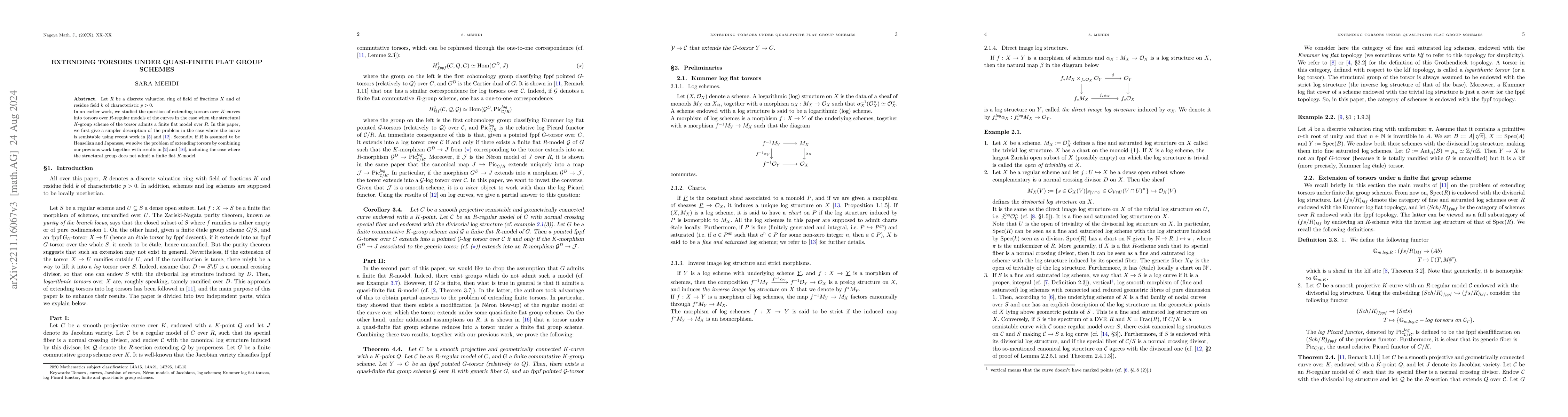 This paper investigates extending torsors over a field $K$ into torsors over a discrete valuation ring $R$, focusing on semistable curves. It provides a simplified approach for semistable cases and solves the extension problem for Henselian and Japanese $R$ even when the structural group lacks a finite flat $R$-model.