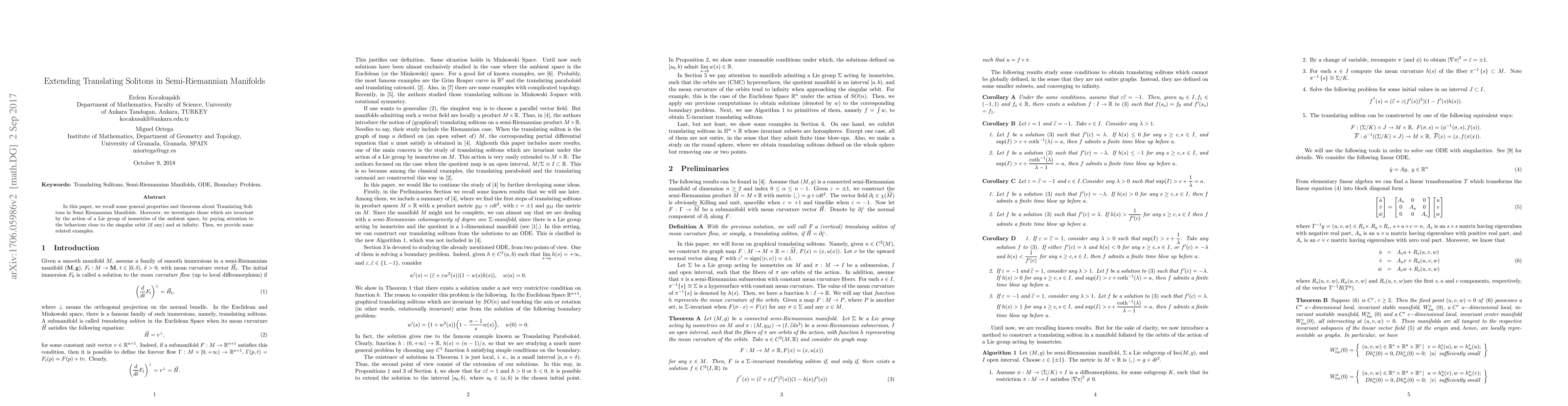 The paper investigates Translating Solitons in Semi-Riemannian Manifolds, focusing on those invariant under the action of a Lie group of isometries, with attention to singular orbits and behavior at infinity.