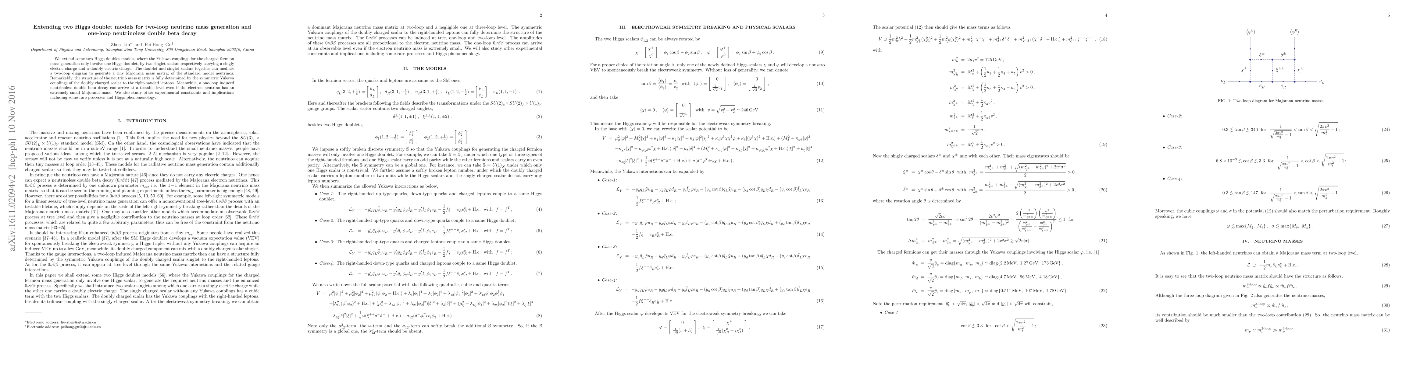 We extend some two Higgs doublet models, where the Yukawa couplings for the charged fermion mass generation only involve one Higgs doublet, by two singlet scalars respectively carrying a singly electric charge and a doubly electric charge. The doublet and singlet scalars together can mediate a two-loop diagram to generate a tiny Majorana mass matrix of the standard model neutrinos. Remarkably, the structure of the neutrino mass matrix is fully determined by the symmetric Yukawa couplings of the doubly charged scalar to the right-handed leptons. Meanwhile, a one-loop induced neutrinoless double beta decay can arrive at a testable level even if the electron neutrino has an extremely small Majorana mass. We also study other experimental constraints and implications including some rare processes and Higgs phenomenology.