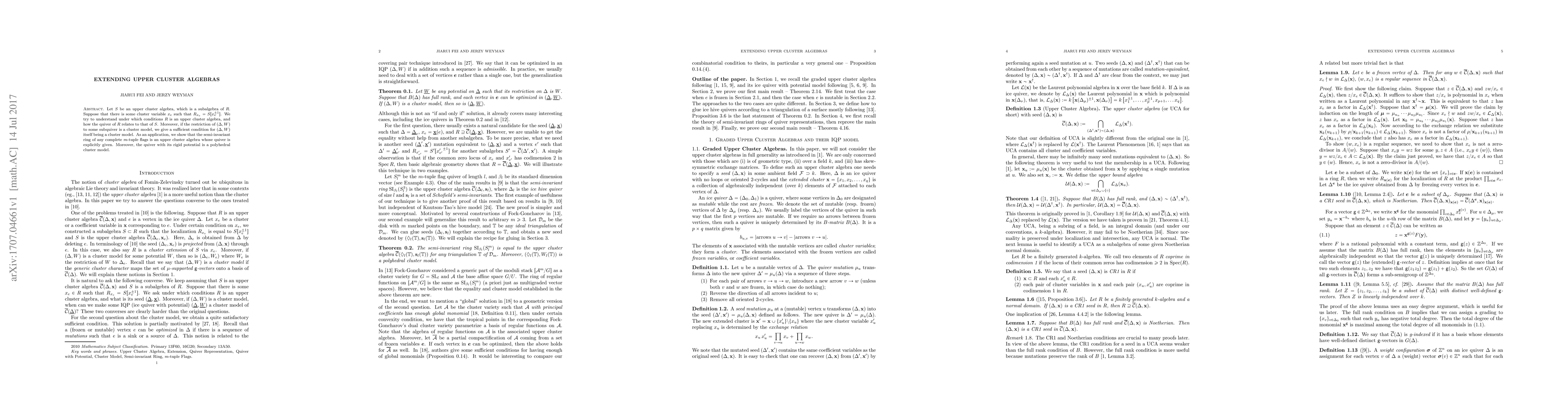 Let $S$ be an upper cluster algebra, which is a subalgebra of $R$. Suppose that there is some cluster variable $x_e$ such that ${R}_{{x}_e} = S[{x}_e^{\pm 1}]$. We try to understand under which conditions ${R}$ is an upper cluster algebra, and how the quiver of $R$ relates to that of $S$. Moreover, if the restriction of $(\Delta,W)$ to some subquiver is a cluster model, we give a sufficient condition for $(\Delta,W)$ itself being a cluster model. As an application, we show that the semi-invariant ring of any complete $m$-tuple flags is an upper cluster algebra whose quiver is explicitly given. Moreover, the quiver with its rigid potential is a polyhedral cluster model.