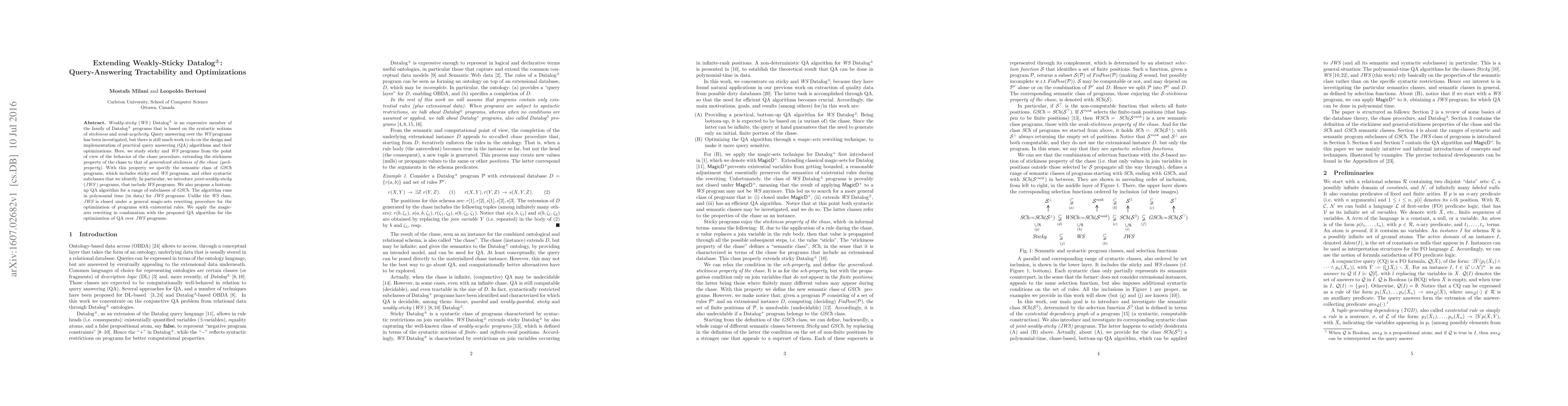 This paper extends weakly-sticky Datalog+/- programs by introducing joint-weakly-sticky (JWS) programs, which include weakly-sticky programs. It proposes a polynomial-time bottom-up query-answering algorithm for JWS programs and optimizes them using a magic-sets rewriting procedure.