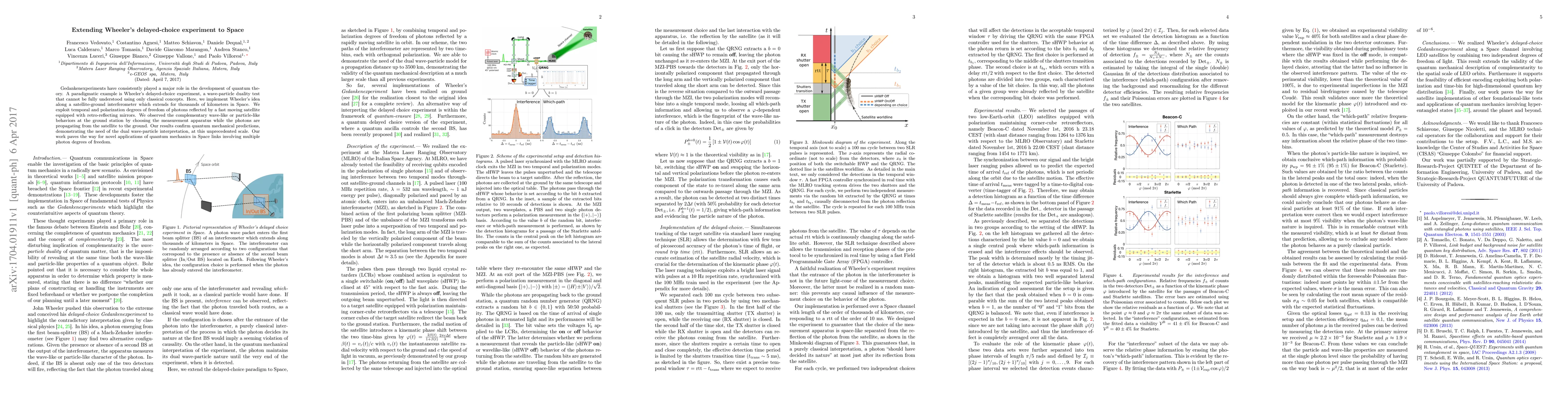 This paper extends Wheeler's delayed-choice experiment to space using a satellite-ground interferometer, confirming quantum mechanical predictions on an unprecedented scale and demonstrating the dual wave-particle interpretation. The study paves the way for new quantum mechanics applications in space-based links.