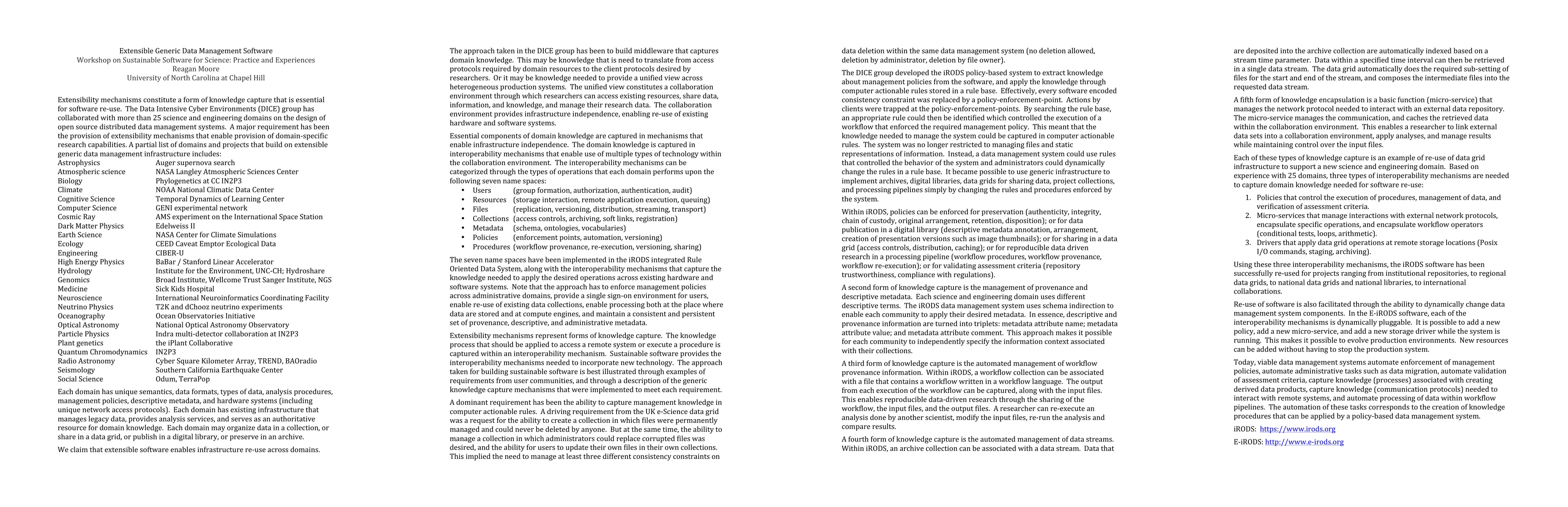 Extensibility mechanisms constitute a form of knowledge capture that is essential for software re-use. The Data Intensive Cyber Environments (DICE) group has collaborated with twenty-five science and engineering domains on the application of the iRODS policy-based data management system. Based on these collaborations, three types of extensibility mechanisms are sufficient to capture the domain knowledge needed for interaction with domain resources: computer actionable rules that control management policies; computer executable micro-services that encapsulate operations or interaction protocols; and middleware servers that apply standard operations at remote locations. These mechanisms enable the creation of generic data management software that is capable of implementing collections, data grids for sharing data, digital libraries for publishing data, processing pipelines, and archives.