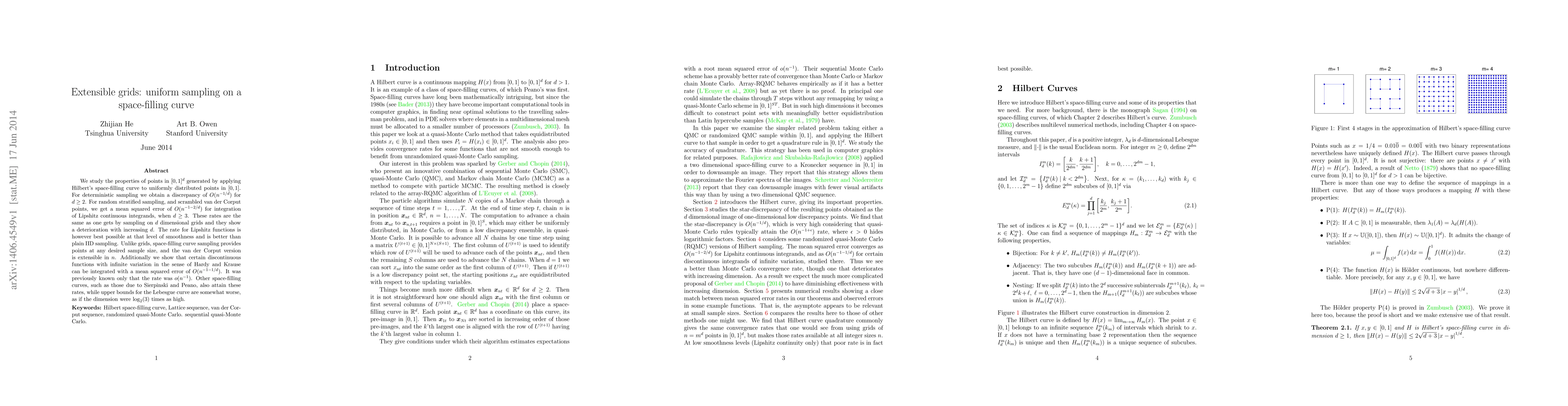 This paper investigates the properties of points generated by applying Hilbert's space-filling curve to uniformly distributed points in $[0,1]^d$, achieving a discrepancy of $O(n^{-1/d})$ for deterministic sampling. It also demonstrates optimal mean squared error rates for integration of Lipschitz continuous integrands using random stratified sampling and scrambled van der Corput points, outperforming plain IID sampling.
