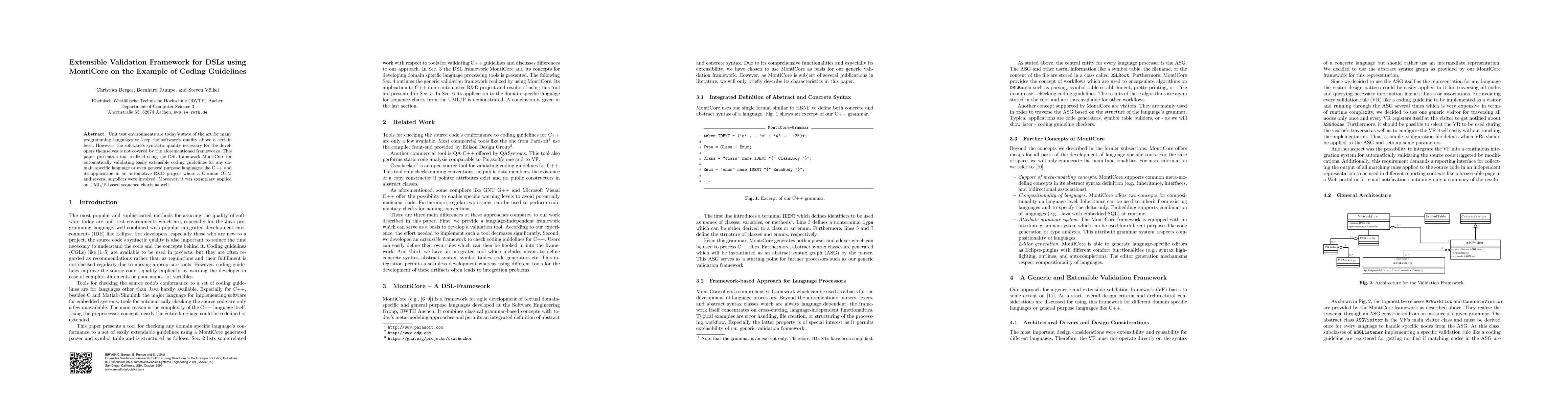 Unit test environments are today's state of the art for many programming languages to keep the software's quality above a certain level. However, the software's syntactic quality necessary for the developers themselves is not covered by the aforementioned frameworks. This paper presents a tool realized using the DSL framework MontiCore for automatically validating easily extensible coding guidelines for any domain specific language or even general purpose languages like C++ and its application in an automotive R&D project where a German OEM and several suppliers were involved. Moreover, it was exemplary applied on UML/P-based sequence charts as well.