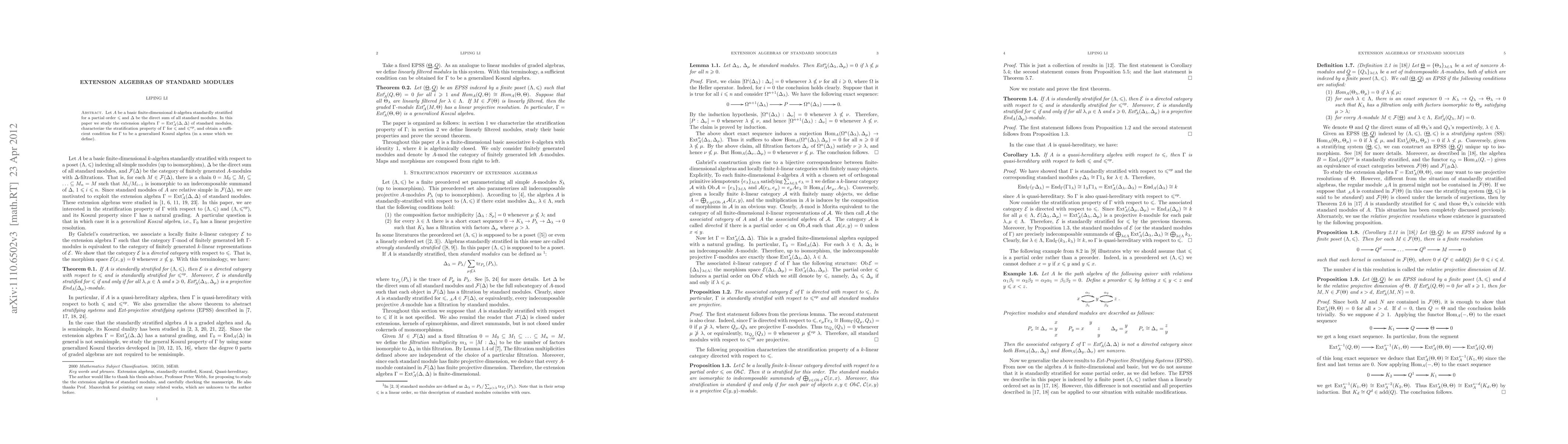 This paper examines the extension algebra $E = \text{Ext}_A^{\ast} (\Delta, \Delta)$ of standard modules for a finite-dimensional $k$-algebra $A$, characterizing its stratification and providing a condition for $E$ to be a generalized Koszul algebra.