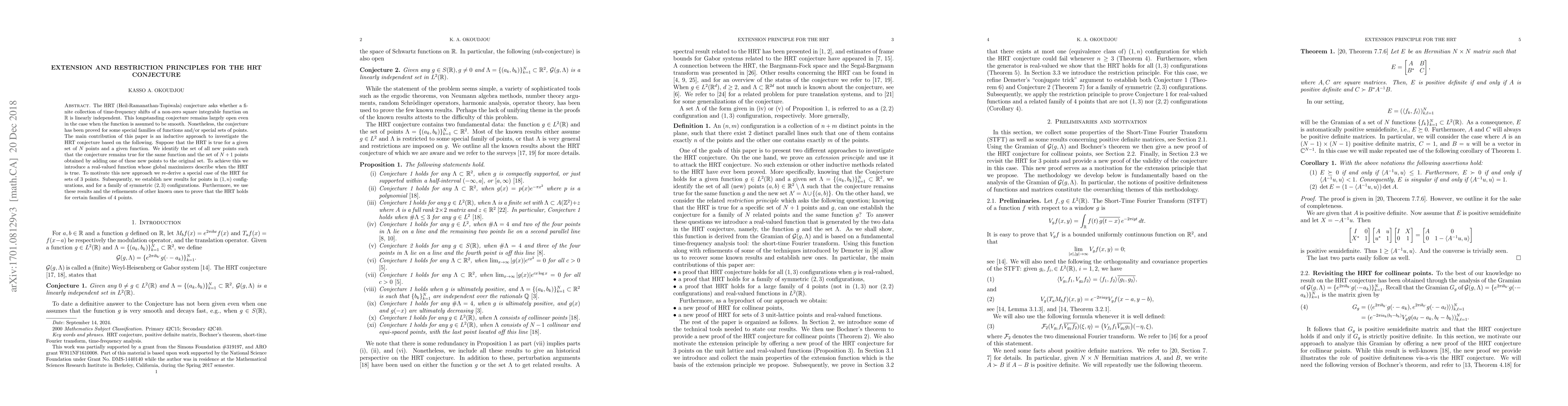 The paper explores the Heil-Ramanathan-Topiwala conjecture, a problem in mathematics that deals with linear independence of time-frequency shifts of functions on the real line. The authors make progress by developing an inductive approach to prove the conjecture for certain configurations of points and functions.