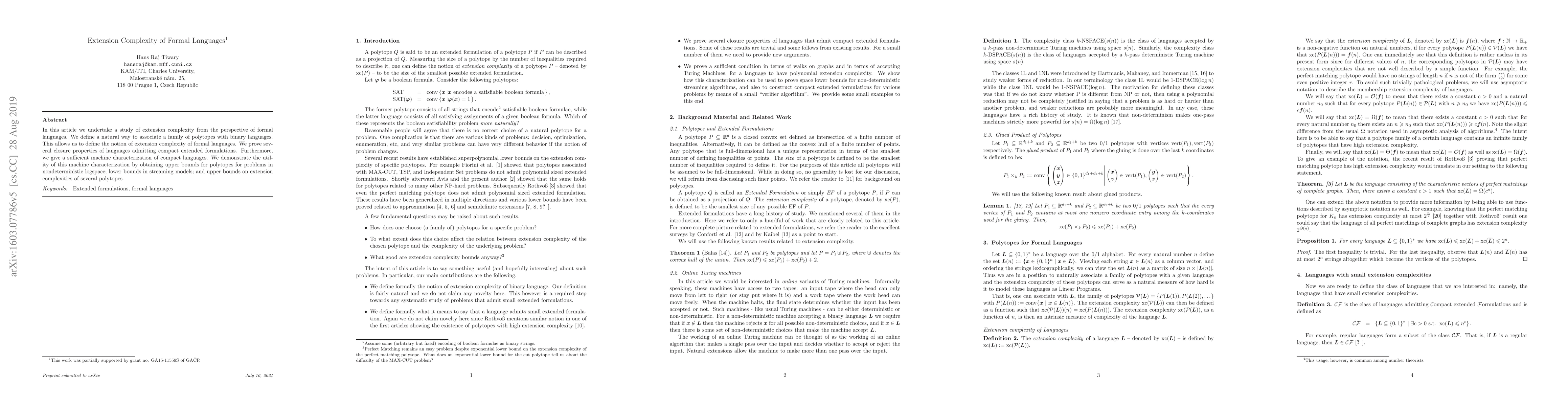 This paper explores extension complexity in formal languages through associated families of polytopes, proving closure properties and providing a machine characterization of compact languages. It also demonstrates the utility of this characterization in deriving bounds for various computational problems.