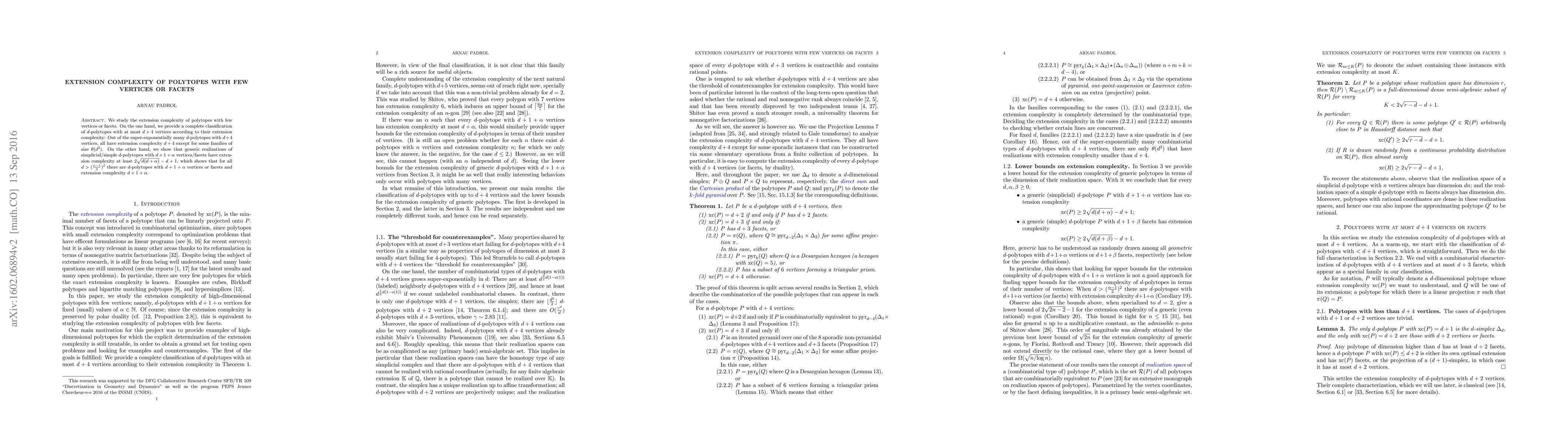 This paper classifies the extension complexity of $d$-polytopes with at most $d+4$ vertices, finding all but some $\theta(d^2)$ families have complexity $d+4$. It also establishes a lower bound for the extension complexity of generic simplicial/simple $d$-polytopes with $d+1+\alpha$ vertices/facets, showing complexity at least $2 \sqrt{d(d+\alpha)} - d + 1$.