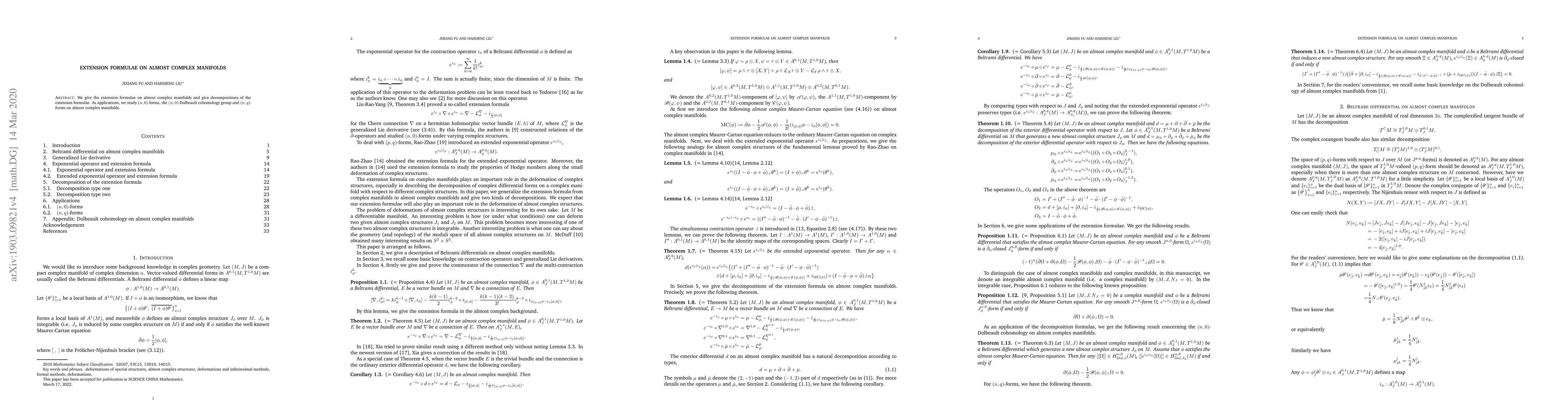 Summary: This paper provides extension formulae on almost complex manifolds and decomposes these formulae. It applies these results to study $(n,0)$-forms and the $(n,0)$-Dolbeault cohomology group, alongside $(n,q)$-forms.