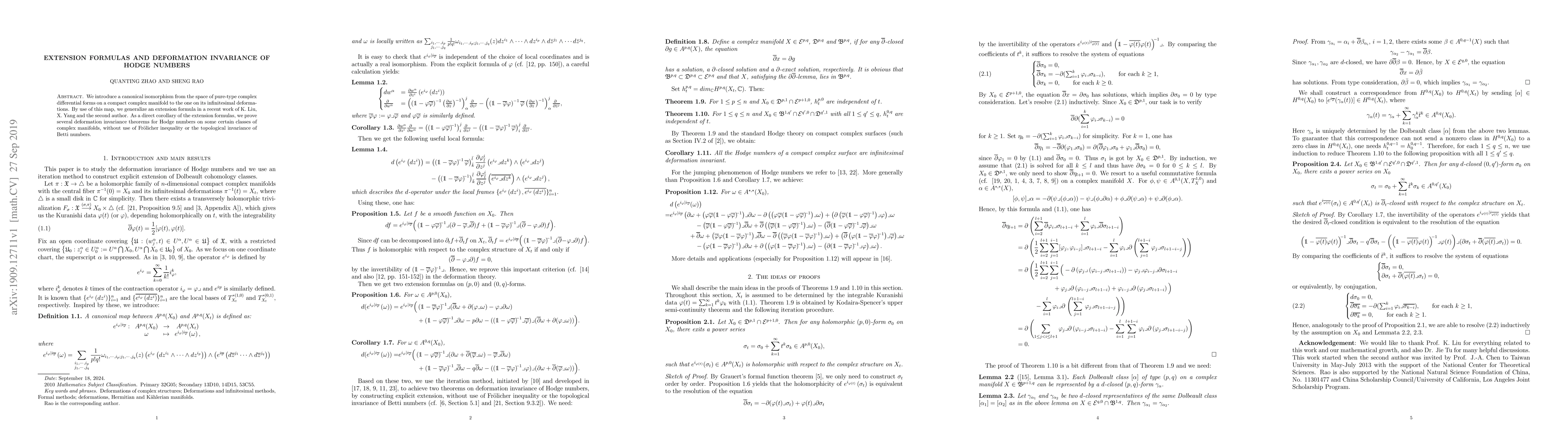 We introduce a canonical isomorphism from the space of pure-type complex differential forms on a compact complex manifold to the one on its infinitesimal deformations. By use of this map, we generalize an extension formula in a recent work of K. Liu, X. Yang and the second author. As a direct corollary of the extension formulas, we prove several deformation invariance theorems for Hodge numbers on some certain classes of complex manifolds, without use of Fr\"{o}licher inequality or the topological invariance of Betti numbers.