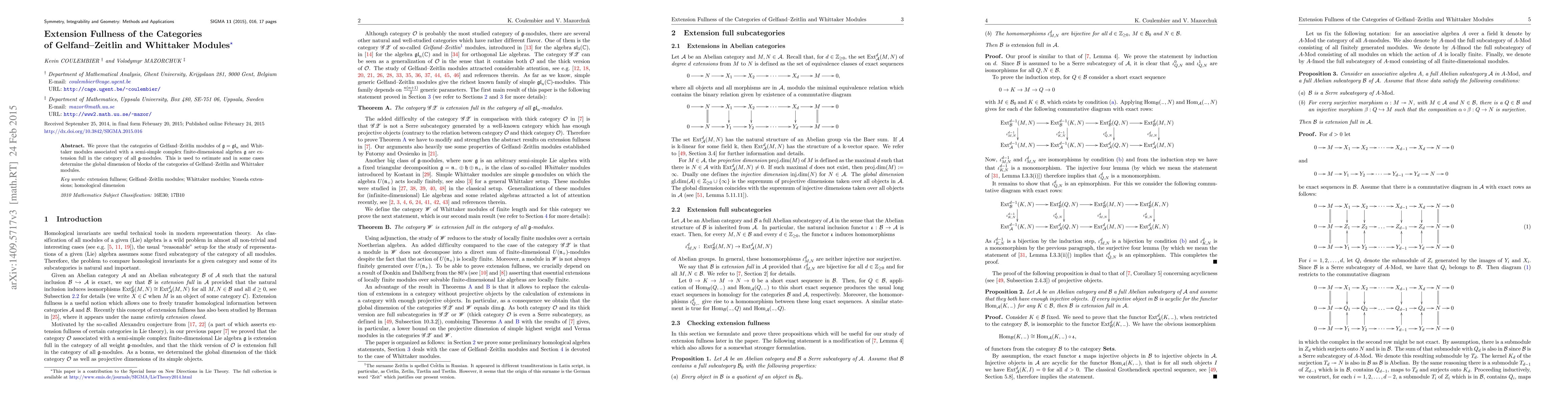 Summary: The paper establishes that Gelfand-Zeitlin modules for $\mathfrak{gl}_n$ and Whittaker modules for semi-simple $\mathfrak{g}$ are extension full in the category of all $\mathfrak{g}$-modules, which aids in estimating the global dimension of relevant module categories.