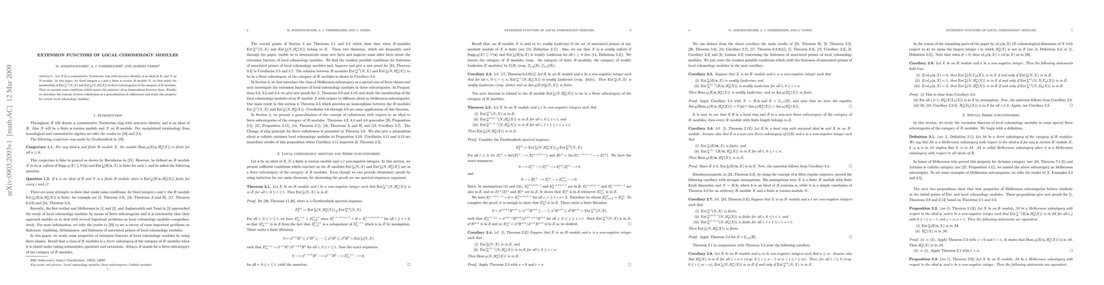 This paper investigates the relationship between $\Ext$ functors of local cohomology modules in a commutative Noetherian ring $R$, examining conditions under which $\Ext^{s+t}_{R}(N, X)$ and $\Ext^{s}_{R}(N, H^{t}_{\fa}(X))$ belong to Serre subcategories and exploring the isomorphism between them. It also introduces the concept of Serre cofiniteness for local cohomology modules.