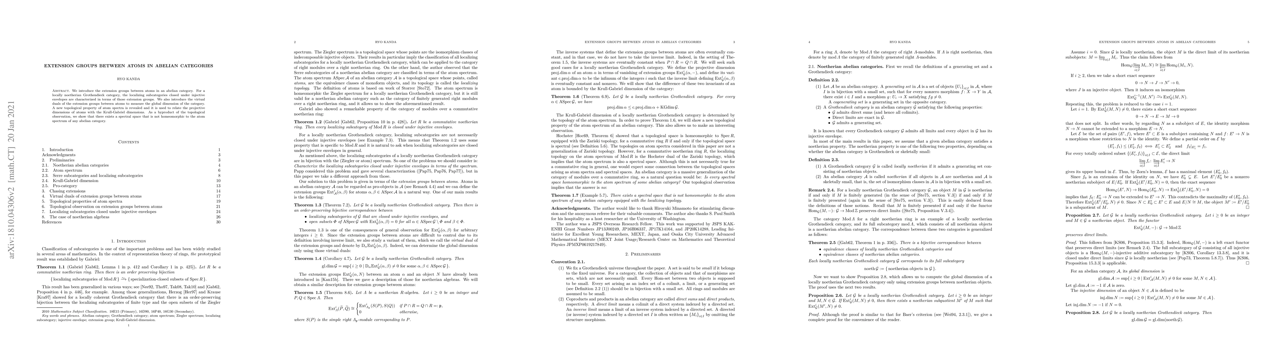 We introduce the extension groups between atoms in an abelian category. For a locally noetherian Grothendieck category, the localizing subcategories closed under injective envelopes are characterized in terms of those extension groups. We also introduce the virtual duals of the extension groups between atoms to measure the global dimension of the category. A new topological property of atom spectra is revealed and it is used to relate the projective dimensions of atoms with the Krull-Gabriel dimensions. As a byproduct of the topological observation, we show that there exists a spectral space that is not homeomorphic to the atom spectrum of any abelian category.
