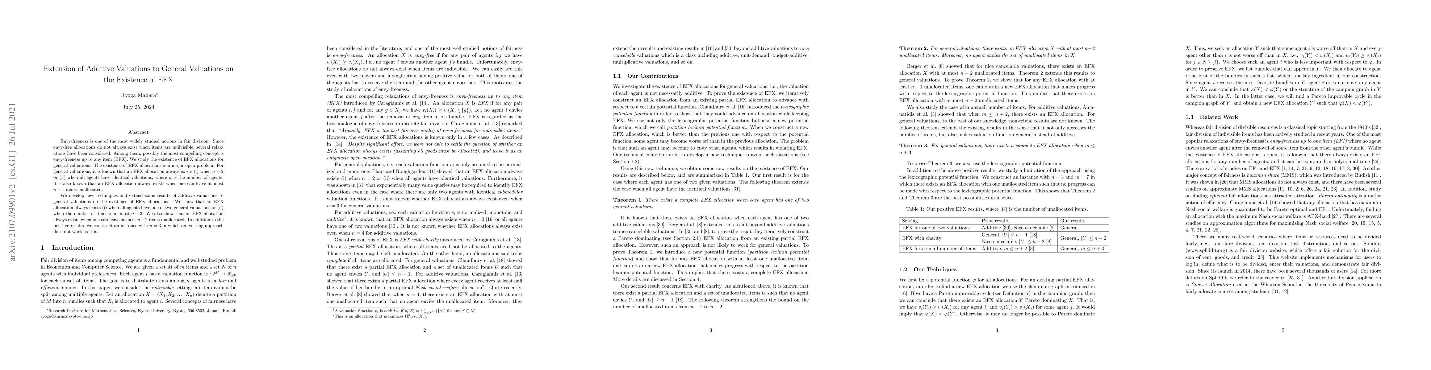 This paper explores the existence of envy-freeness up to any item (EFX) allocations for general valuations, extending techniques from additive valuations. It establishes that EFX allocations exist under specific conditions, including when all agents share one of two general valuations or when the number of items is at most $n+3$.