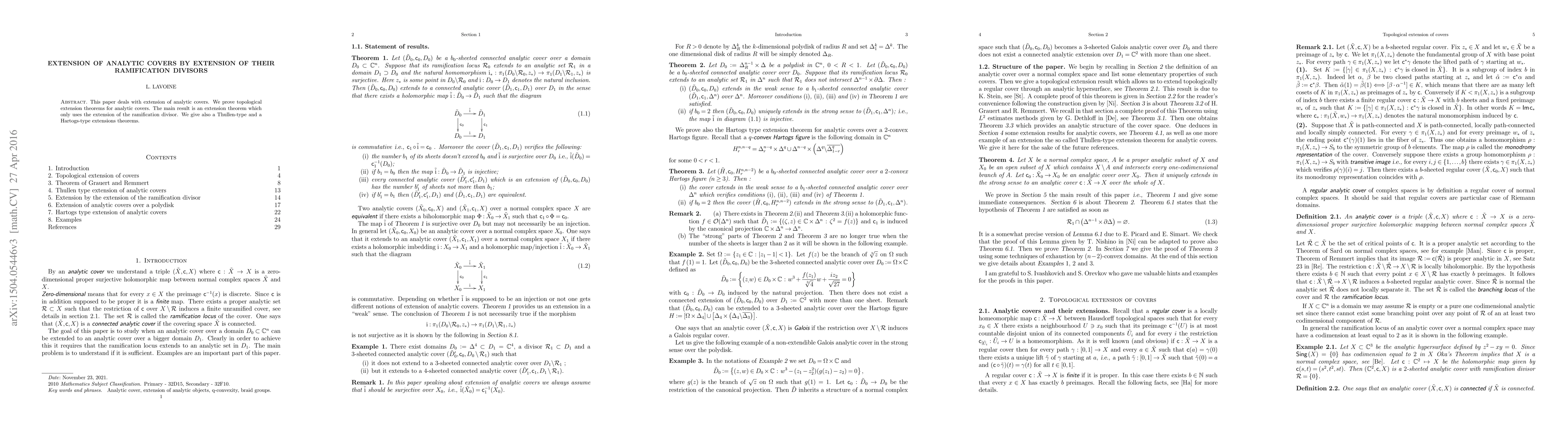 This paper deals with extension of analytic covers. We prove topological extension theorems for analytic covers. The main result is an extension theorem which only uses the extension of the ramification divisor. We give also a Thullen-type and a Hartogs-type extensions theorems.