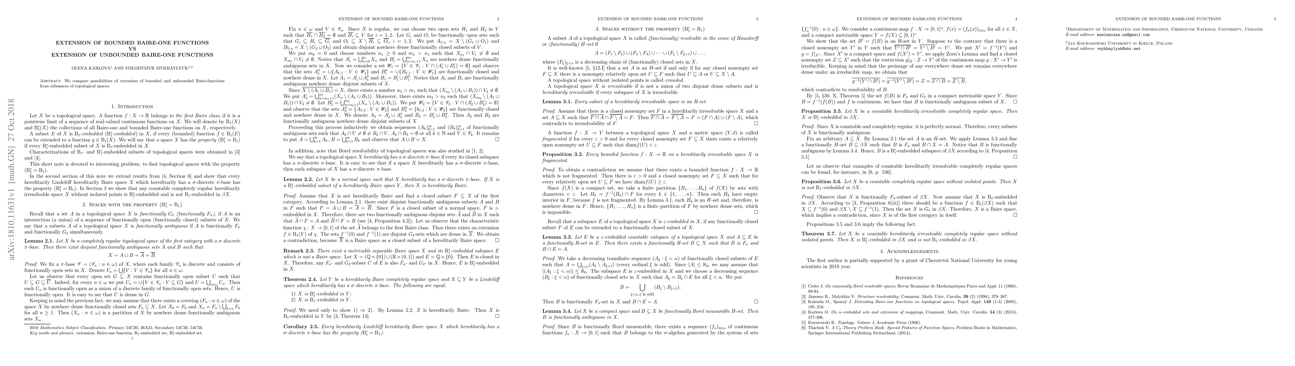 Summary: This paper examines the extension capabilities of bounded versus unbounded Baire-one functions from subspaces of topological spaces, highlighting differences in their extension potential.