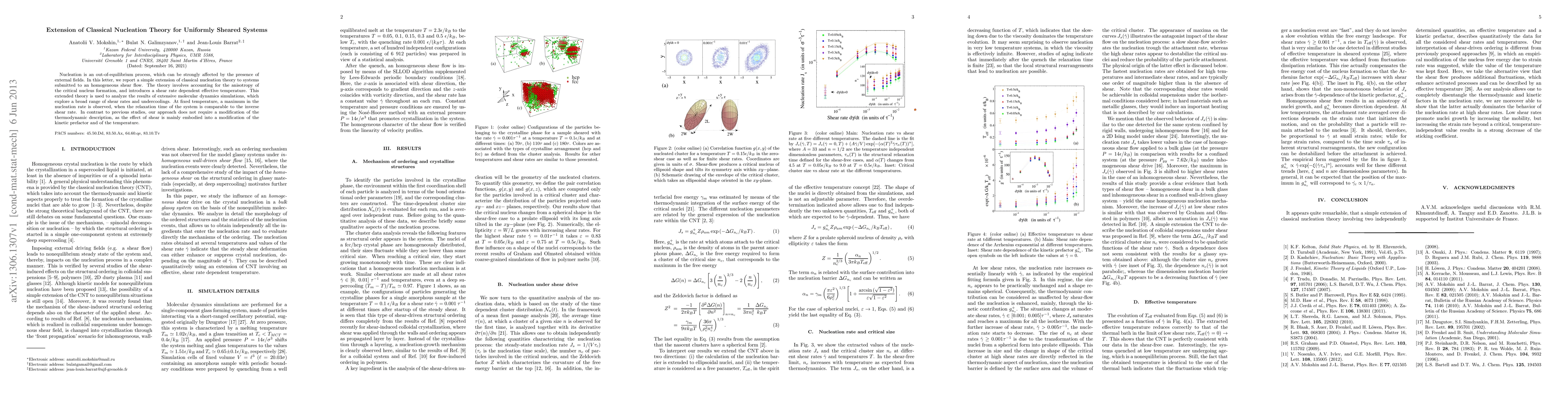 This paper extends classical nucleation theory to uniformly sheared systems, introducing an anisotropy-based model and a shear rate-dependent effective temperature. The new theory aligns with molecular dynamics simulations, revealing a peak nucleation rate when the system's relaxation time matches the inverse shear rate, without altering the thermodynamic framework.
