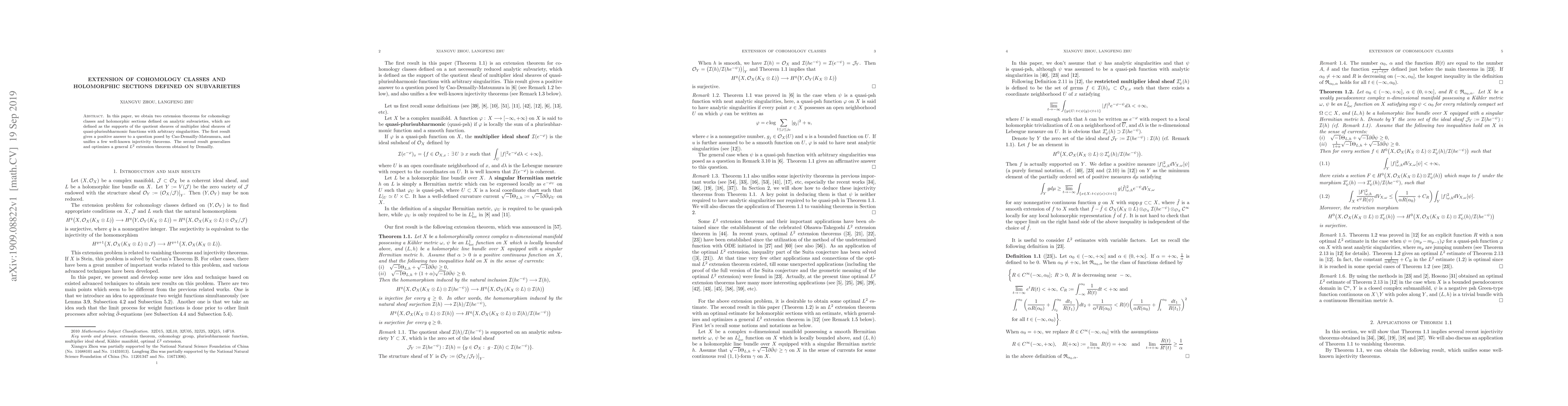 In this paper, we obtain two extension theorems for cohomology classes and holomorphic sections defined on analytic subvarieties, which are defined as the supports of the quotient sheaves of multiplier ideal sheaves of quasi-plurisubharmonic functions with arbitrary singularities. The first result gives a positive answer to a question posed by Cao-Demailly-Matsumura, and unifies a few well-known injectivity theorems. The second result generalizes and optimizes a general $L^2$ extension theorem obtained by Demailly.