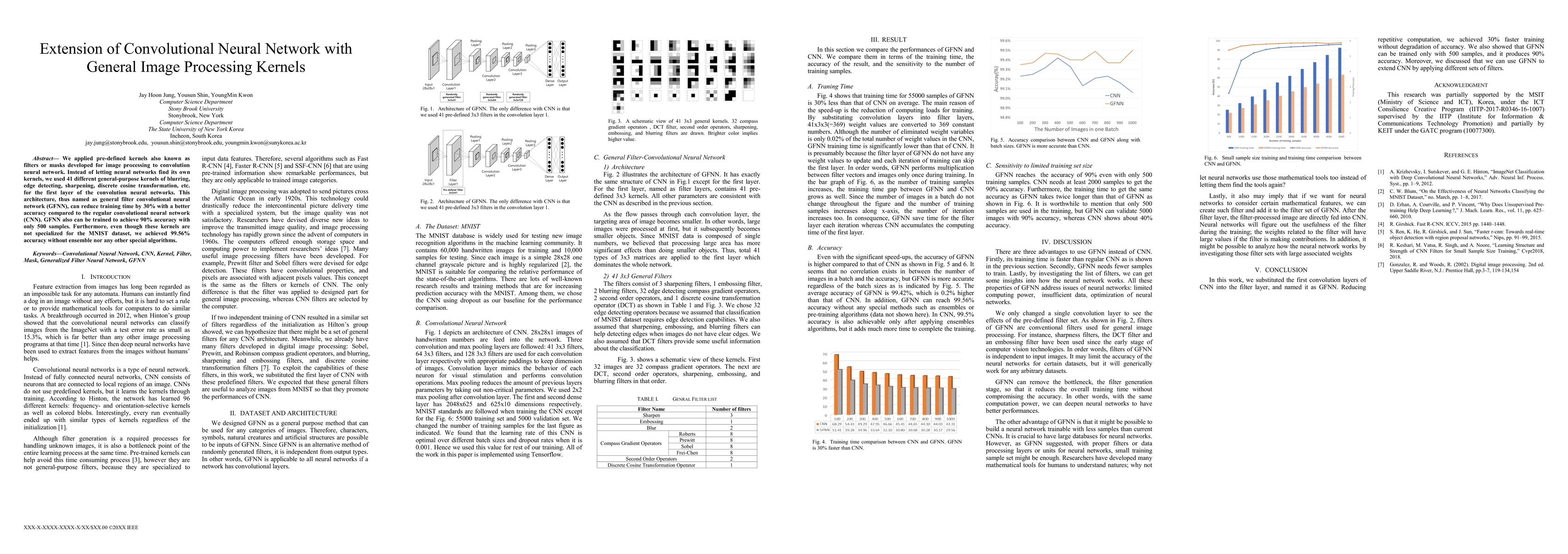 This paper proposes a General Filter Convolutional Neural Network (GFNN) that incorporates 41 predefined image processing kernels in its first layer, reducing training time by 30% and achieving better accuracy compared to regular CNNs. GFNN can attain 90% accuracy with minimal training samples and achieves 99.56% accuracy on the MNIST dataset without ensemble methods.