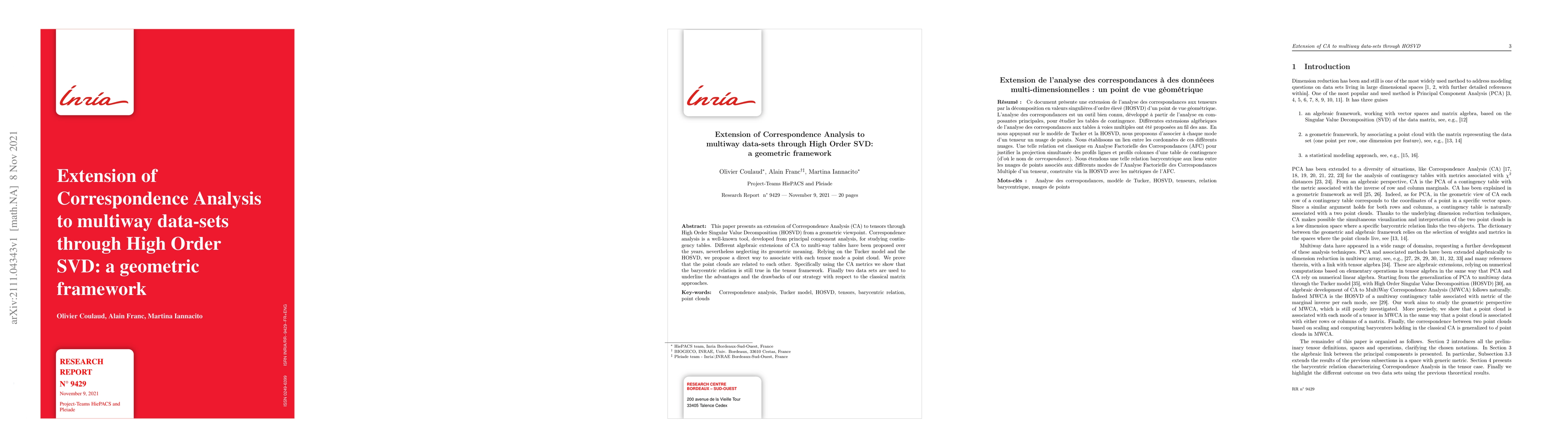 Researchers extend Correspondence Analysis to multi-way data-sets using High Order SVD from a geometric viewpoint, showing that the barycentric relation is still true in the tensor framework.