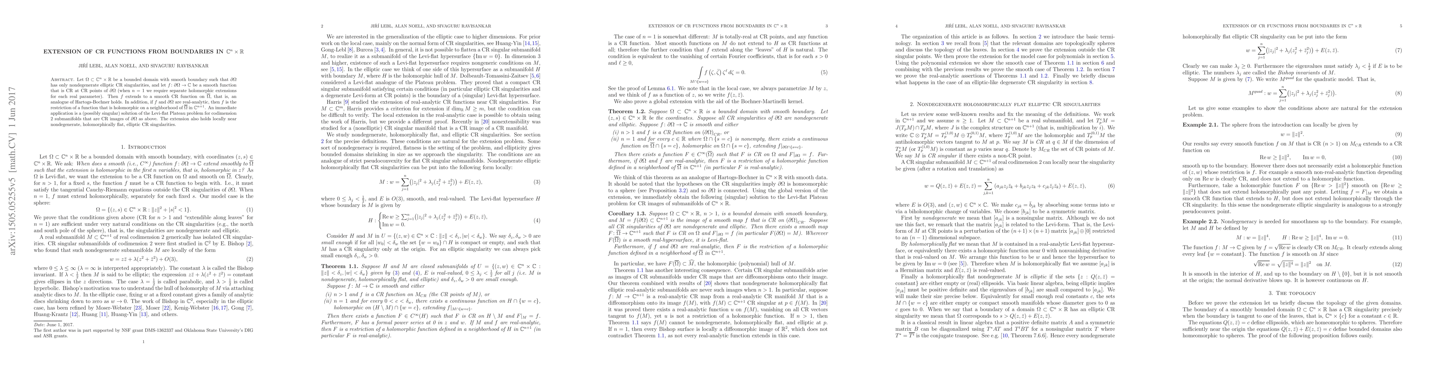 Let $\Omega \subset {\mathbb C}^n \times {\mathbb R}$ be a bounded domain with smooth boundary such that $\partial \Omega$ has only nondegenerate elliptic CR singularities, and let $f \colon \partial \Omega \to {\mathbb C}$ be a smooth function that is CR at CR points of $\partial \Omega$ (when $n=1$ we require separate holomorphic extensions for each real parameter). Then $f$ extends to a smooth CR function on $\bar{\Omega}$, that is, an analogue of Hartogs-Bochner holds. In addition, if $f$ and $\partial \Omega$ are real-analytic, then $f$ is the restriction of a function that is holomorphic on a neighborhood of $\bar{\Omega}$ in ${\mathbb C}^{n+1}$. An immediate application is a (possibly singular) solution of the Levi-flat Plateau problem for codimension 2 submanifolds that are CR images of $\partial \Omega$ as above. The extension also holds locally near nondegenerate, holomorphically flat, elliptic CR singularities.