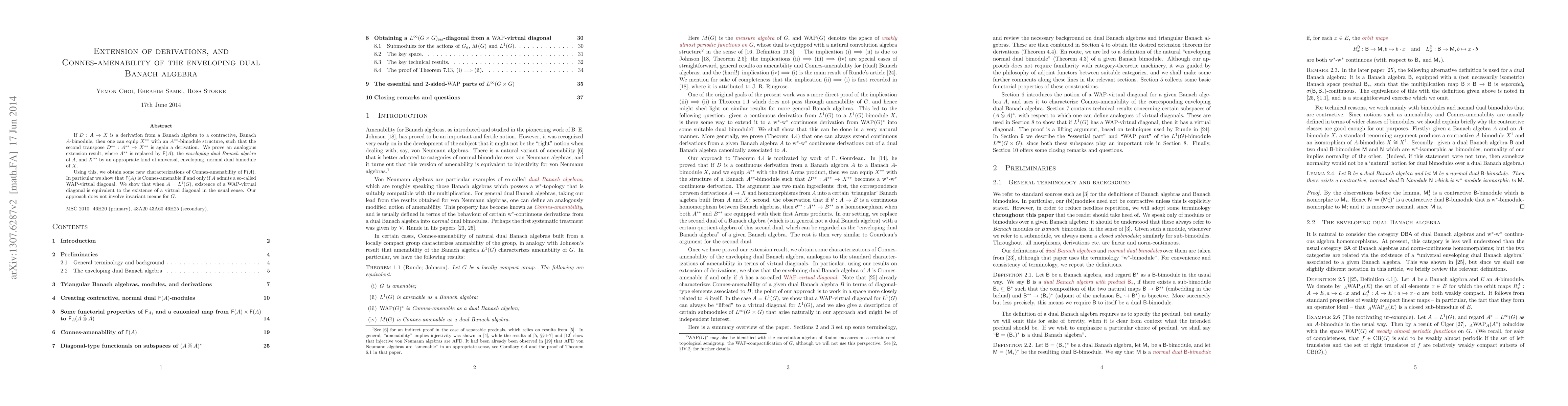 If $D:A \to X$ is a derivation from a Banach algebra to a contractive, Banach $A$-bimodule, then one can equip $X^{**}$ with an $A^{**}$-bimodule structure, such that the second transpose $D^{**}: A^{**} \to X^{**}$ is again a derivation. We prove an analogous extension result, where $A^{**}$ is replaced by $\F(A)$, the \emph{enveloping dual Banach algebra} of $A$, and $X^{**}$ by an appropriate kind of universal, enveloping, normal dual bimodule of $X$. Using this, we obtain some new characterizations of Connes-amenability of $\F(A)$. In particular we show that $\F(A)$ is Connes-amenable if and only if $A$ admits a so-called WAP-virtual diagonal. We show that when $A=L^1(G)$, existence of a WAP-virtual diagonal is equivalent to the existence of a virtual diagonal in the usual sense. Our approach does not involve invariant means for $G$.