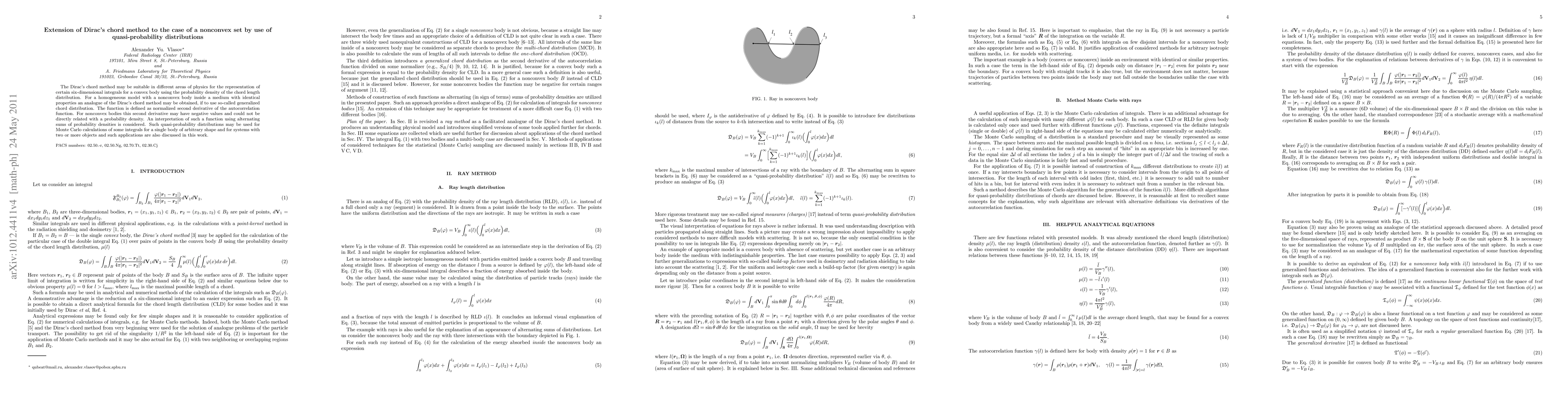 The Dirac's chord method may be suitable in different areas of physics for the representation of certain six-dimensional integrals for a convex body using the probability density of the chord length distribution. For a homogeneous model with a nonconvex body inside a medium with identical properties an analogue of the Dirac's chord method may be obtained, if to use so-called generalized chord distribution. The function is defined as normalized second derivative of the autocorrelation function. For nonconvex bodies this second derivative may have negative values and could not be directly related with a probability density. An interpretation of such a function using alternating sums of probability densities is considered. Such quasi-probability distributions may be used for Monte Carlo calculations of some integrals for a single body of arbitrary shape and for systems with two or more objects and such applications are also discussed in this work.