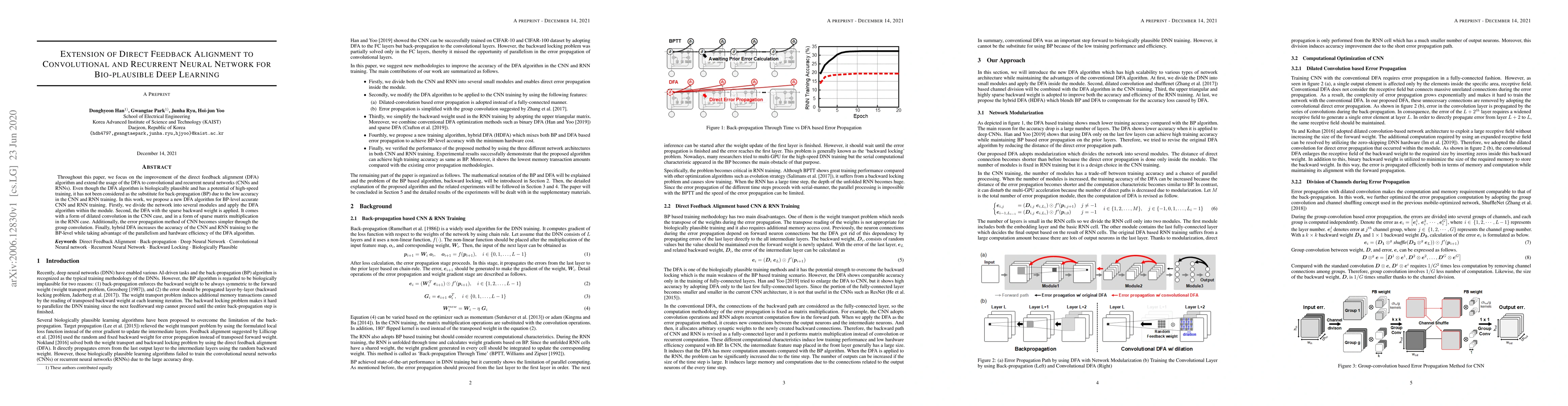 Throughout this paper, we focus on the improvement of the direct feedback alignment (DFA) algorithm and extend the usage of the DFA to convolutional and recurrent neural networks (CNNs and RNNs). Even though the DFA algorithm is biologically plausible and has a potential of high-speed training, it has not been considered as the substitute for back-propagation (BP) due to the low accuracy in the CNN and RNN training. In this work, we propose a new DFA algorithm for BP-level accurate CNN and RNN training. Firstly, we divide the network into several modules and apply the DFA algorithm within the module. Second, the DFA with the sparse backward weight is applied. It comes with a form of dilated convolution in the CNN case, and in a form of sparse matrix multiplication in the RNN case. Additionally, the error propagation method of CNN becomes simpler through the group convolution. Finally, hybrid DFA increases the accuracy of the CNN and RNN training to the BP-level while taking advantage of the parallelism and hardware efficiency of the DFA algorithm.