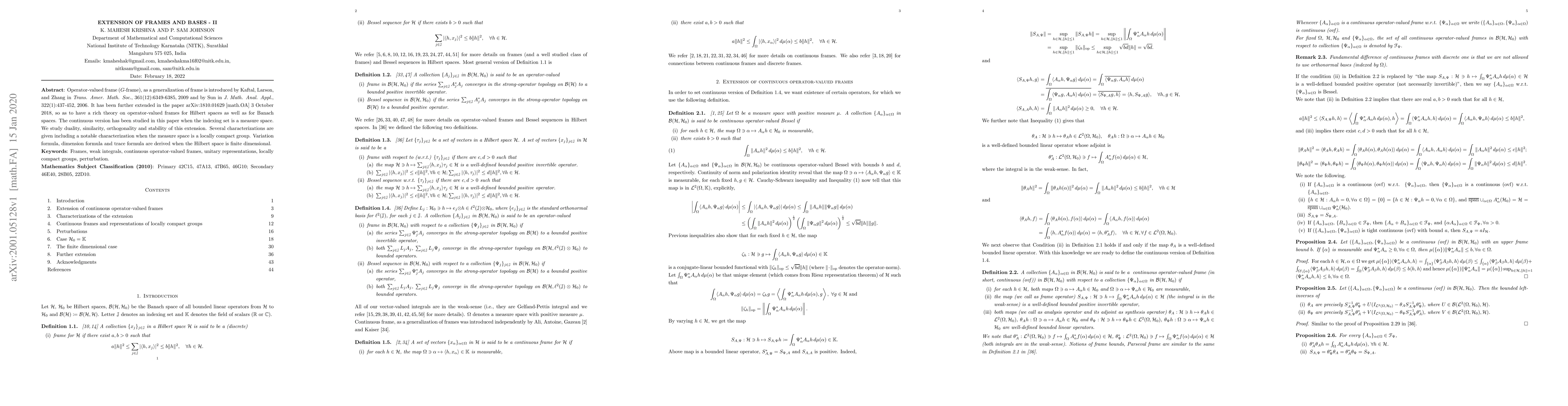 Operator-valued frame ($G$-frame), as a generalization of frame is introduced by Kaftal, Larson, and Zhang in \textit{Trans. Amer. Math. Soc.}, 361(12):6349-6385, 2009 and by Sun in \textit{J. Math. Anal. Appl.}, 322(1):437-452, 2006. It has been further extended in the paper arXiv:1810.01629 [math.OA] 3 October 2018, so as to have a rich theory on operator-valued frames for Hilbert spaces as well as for Banach spaces. The continuous version has been studied in this paper when the indexing set is a measure space. We study duality, similarity, orthogonality and stability of this extension. Several characterizations are given including a notable characterization when the measure space is a locally compact group. Variation formula, dimension formula and trace formula are derived when the Hilbert space is finite dimensional.