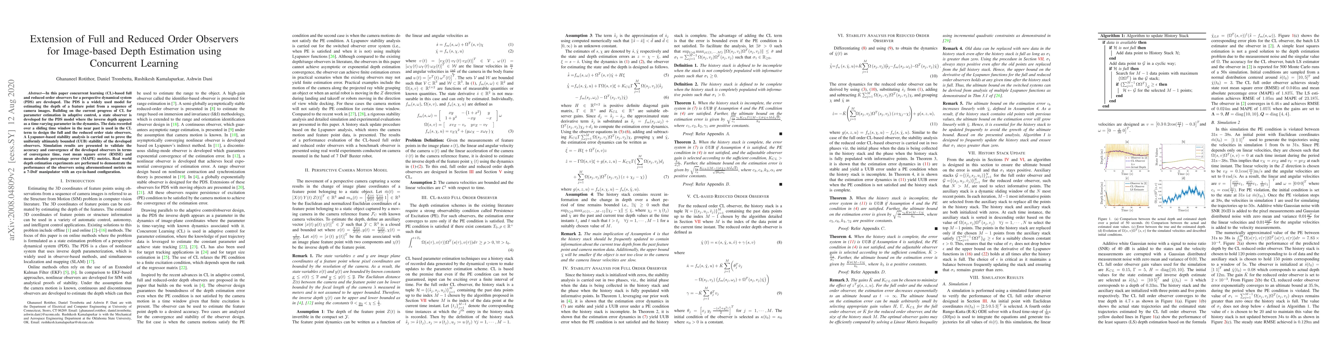 In this paper concurrent learning (CL)-based full and reduced order observers for a perspective dynamical system (PDS) are developed. The PDS is a widely used model for estimating the depth of a feature point from a sequence of camera images. Building on the current progress of CL for parameter estimation in adaptive control, a state observer is developed for the PDS model where the inverse depth appears as a time-varying parameter in the dynamics. The data recorded over a sliding time window in the near past is used in the CL term to design the full and the reduced order state observers. A Lyapunov-based stability analysis is carried out to prove the uniformly ultimately bounded (UUB) stability of the developed observers. Simulation results are presented to validate the accuracy and convergence of the developed observers in terms of convergence time, root mean square error (RMSE) and mean absolute percentage error (MAPE) metrics. Real world depth estimation experiments are performed to demonstrate the performance of the observers using aforementioned metrics on a 7-DoF manipulator with an eye-in-hand configuration.