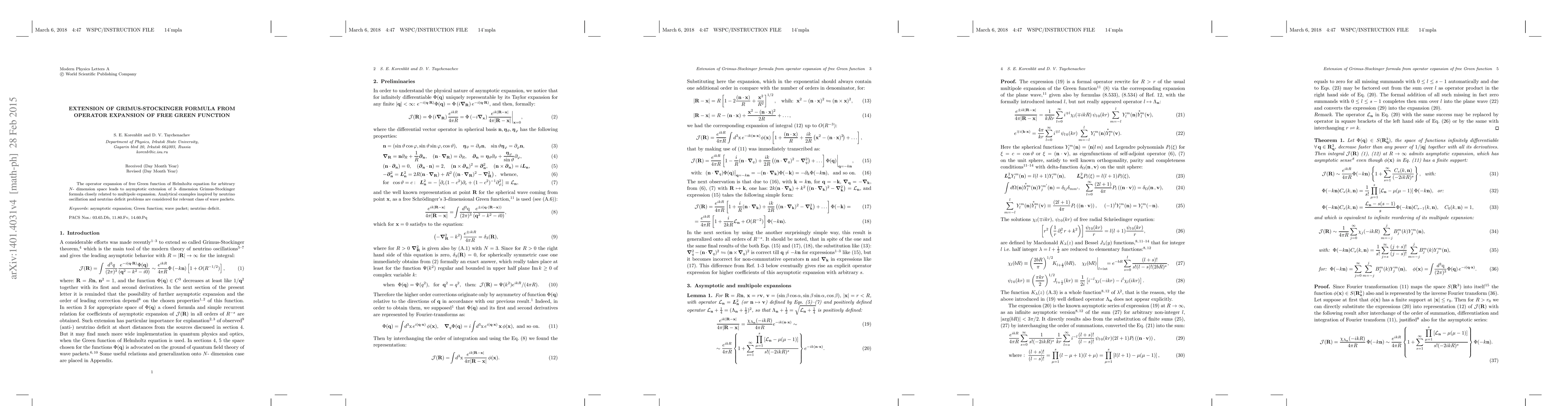 The operator expansion of free Green function of Helmholtz equation for arbitrary N- dimension space leads to asymptotic extension of 3- dimension Grimus-Stockinger formula closely related to multipole expansion. Analytical examples inspired by neutrino oscillation and neutrino deficit problems are considered for relevant class of wave packets