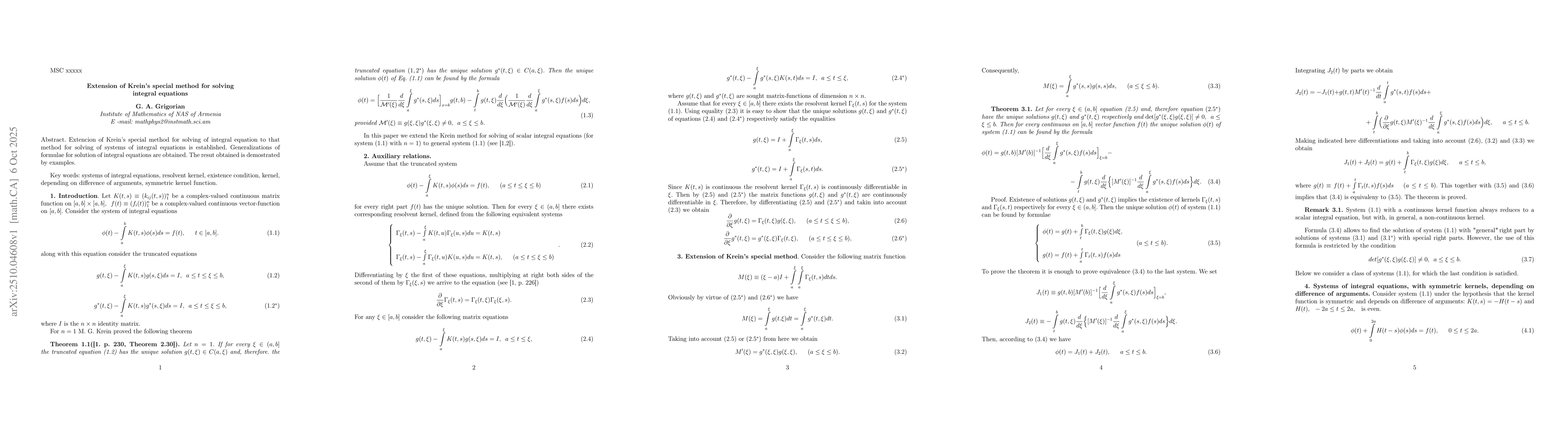 The research extends Krein's special method by generalizing it to solve systems of integral equations. It involves deriving formulae for solutions, proving their validity through equivalence with existing solution systems, and demonstrating results with examples.