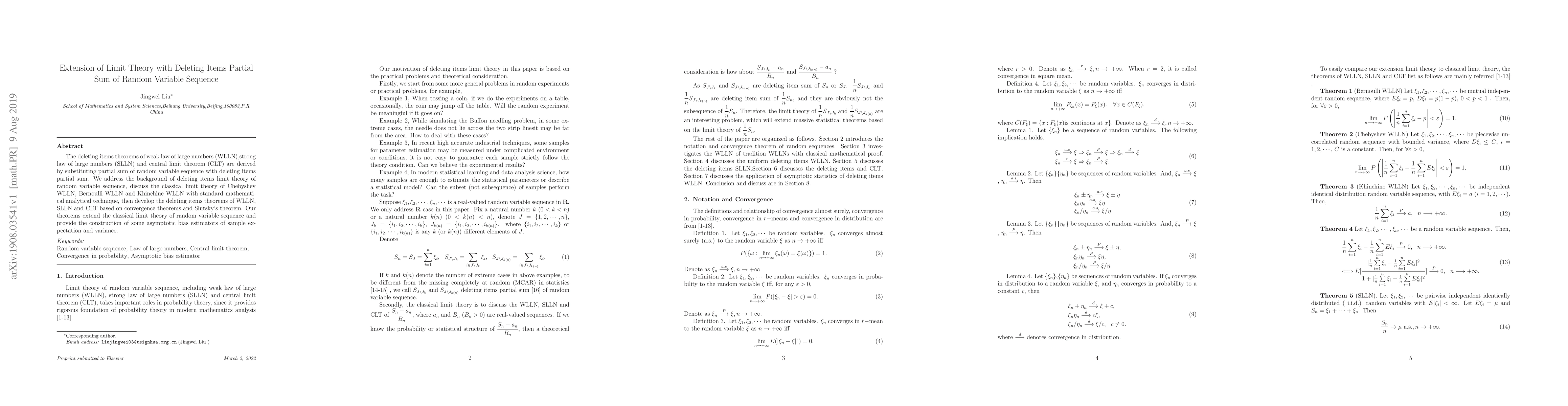 This paper extends classical limit theory by deriving theorems for the weak law of large numbers, strong law of large numbers, and central limit theorem using a modified partial sum sequence that excludes certain items. It provides new asymptotic bias estimators for sample expectation and variance.